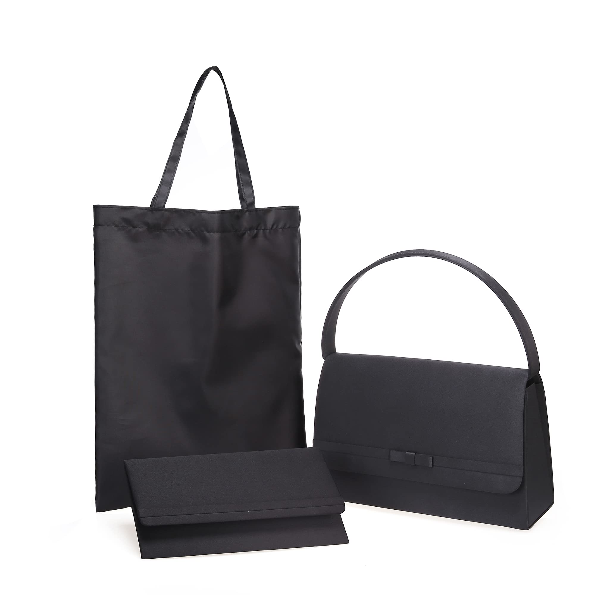【新型フォーマルバッグ】冠婚葬祭に万能な3点セット商品が登場! シンプルかつ上品なデザインの黒バッグ。シンプルなデザインに仕上げました。かぶせ部分がリボン付けて、上品なアクセント。【サブバッグ】普段はフォーマルバッグの中に入れておけば荷物が増えたいざと、慶弔両用出来るすぐれもの。1つ持っておけば安心です。