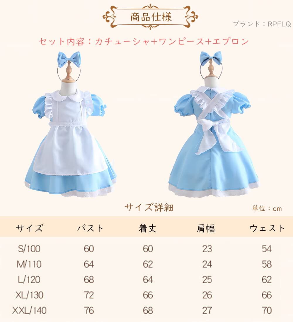 [RPFLQ] アリス 女の子 メイド服 プリンセス ドレス コスプレ ハロウィン 仮装 エプロン 半袖 子供 キッズ 女児 衣装 可愛い 萌え 人気 イベント 活動 なりきり ワンピース 水色 ブルー 3点セット