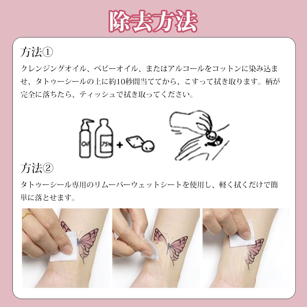 【使用上の注意】敏感肌やアレルギーがある方は使用を避けてください。タトゥーが完全に現れるまで24〜72時間かかりますのでご注意ください。