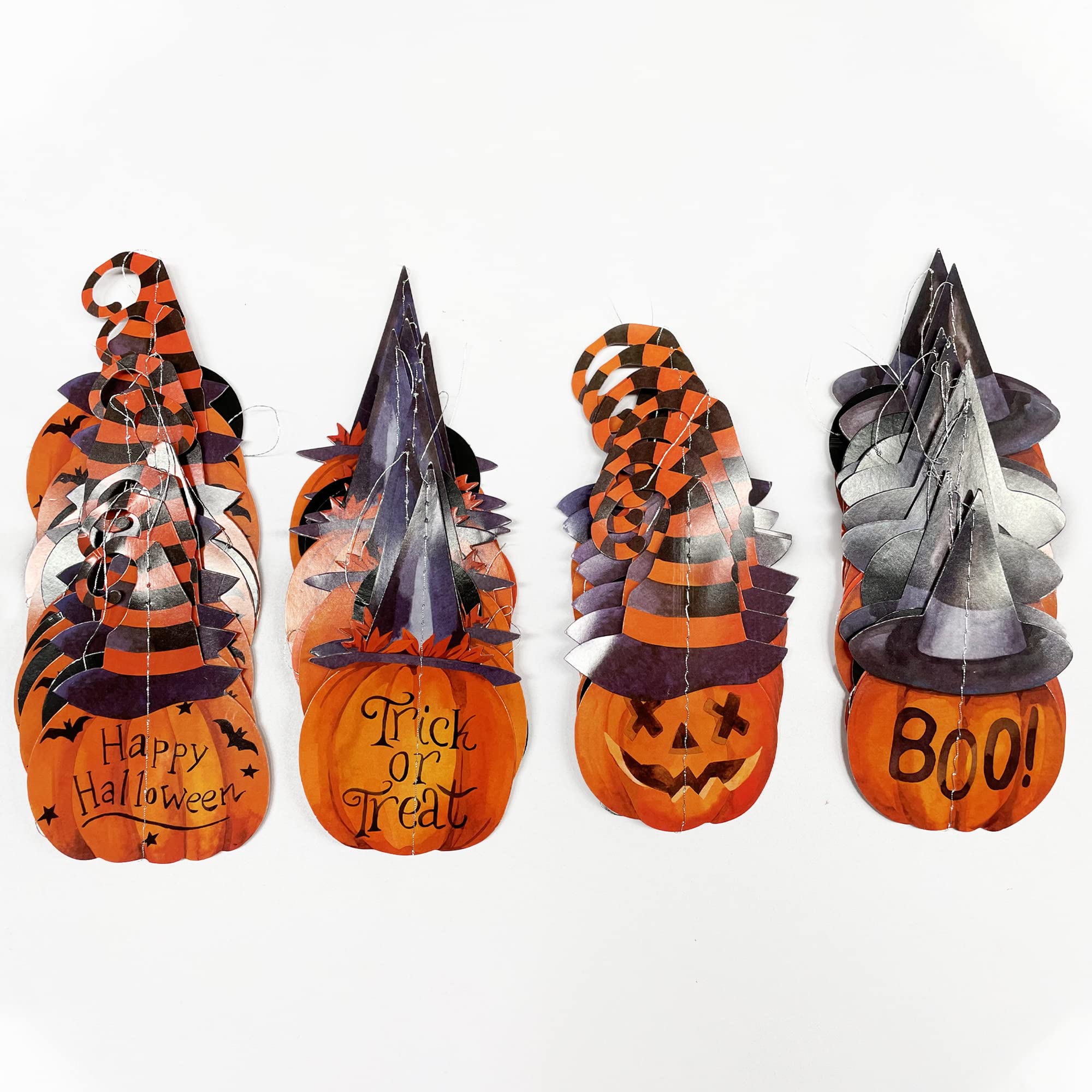??【ユニークなデザイン】ハロウィーンの古典的なカボチャの魔女の帽子のパターンデザインに、黒とオレンジの円のドット、さらにハロウィーンの古典的なサイン「トリック・オア・トリート」「ハッピーハロウィン」「BOO」。このパーティー ガーランドは、秋のハロウィン ホリデー パーティーの装飾をより特別で素晴らしいものにします。