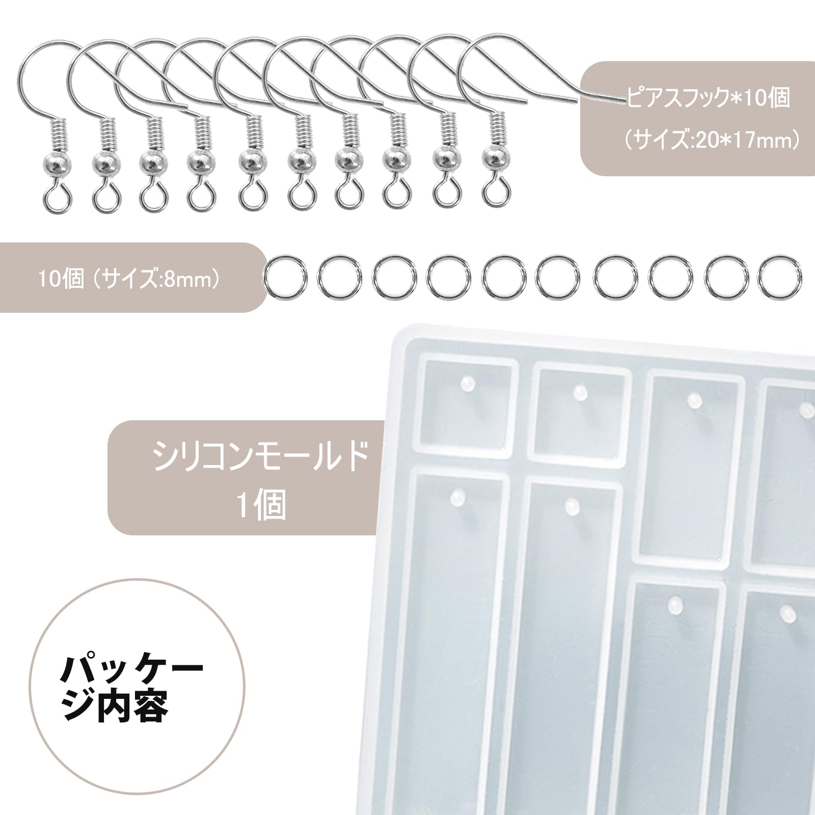 【製品仕様】:●「セット内容」:シリコンモールド*1+ピアスフック*10+丸カン*10 ●「サイズ」:画像をご参照ください ●「耐熱温度」:約-40〜230℃ ●「素材」:シリコン