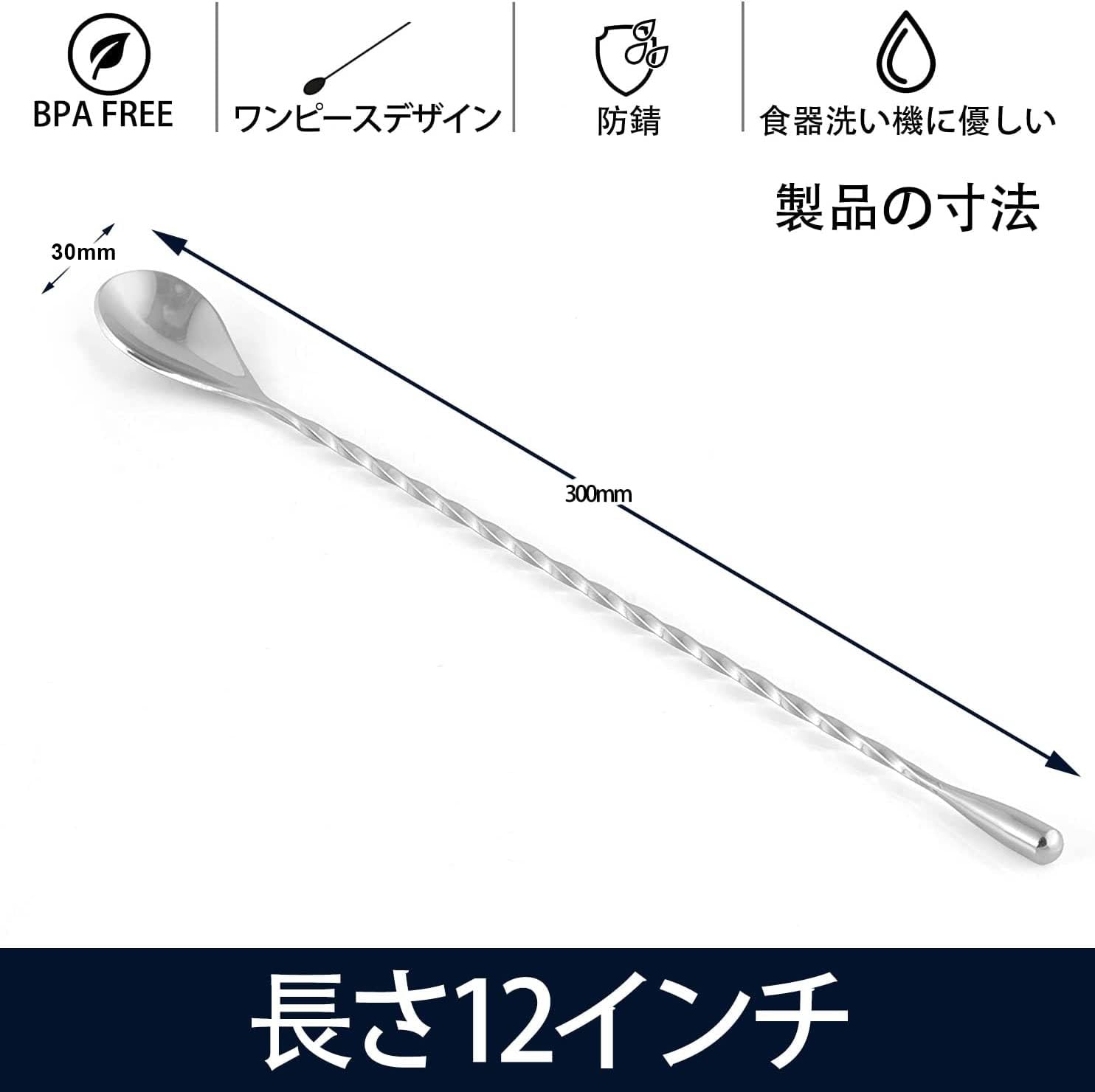 【バースプーン】バースプーンの長さは30cmで、一般的なバースプーンのフォークにあたる部分に、しずく状のデコレーションが施されています。ハイボール マドラーは、より細かいスレッドデザイン、ワンピースの流線型デザイン、高密度研削、より強いトルク、より良い回転感、より繊細なレイヤード流用を採用しています。飲み物をかき混ぜるのにとても適しています。バースプーンのひねりが握りやすく,適度な重量バランスで安定してカクテルを混ぜることができます。マドラースプーン注目される涙のデザインはお酒の調整技術を際立たせます。
