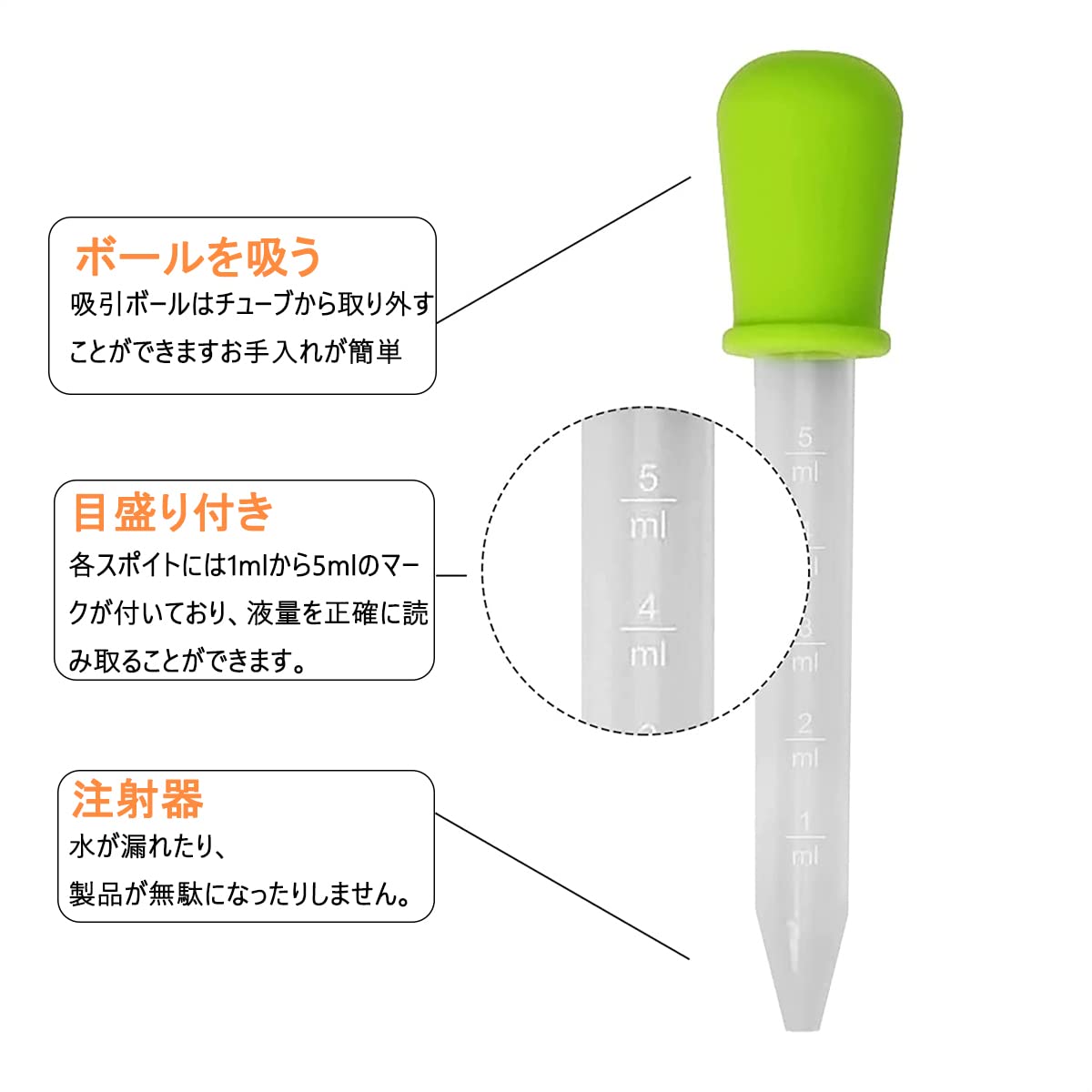 目盛り付き:各スポイトには1mlから5mlのマークが付いており、液量を正確に読み取ることができます。