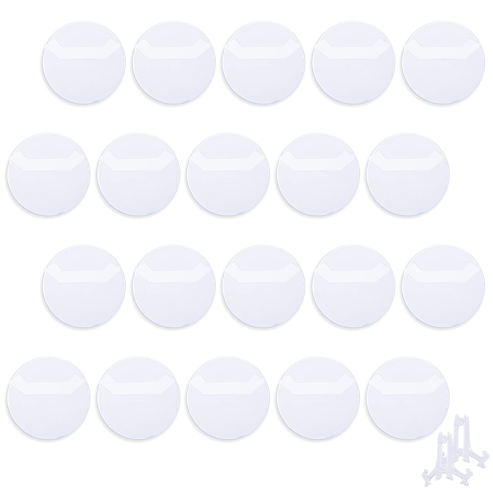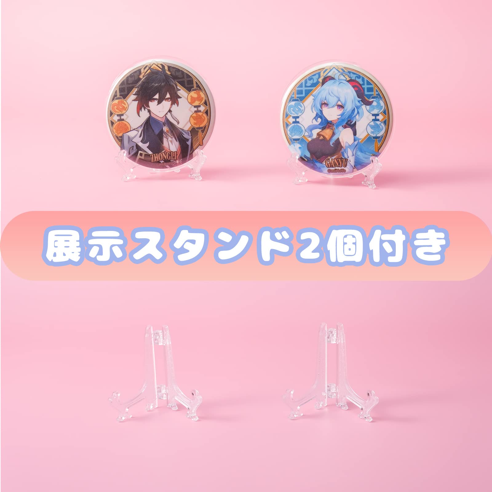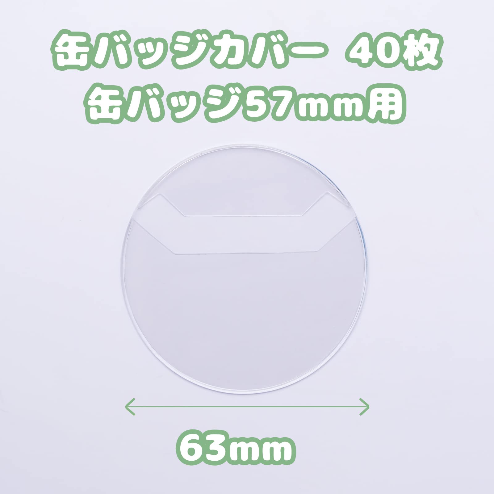 【割引パッケージ】サイズ:円形63mm(缶バッジ57mm用)、量:40枚、材質:PVC。このアイテムには、2つの追加の高品質展示スタンドが付属しています。