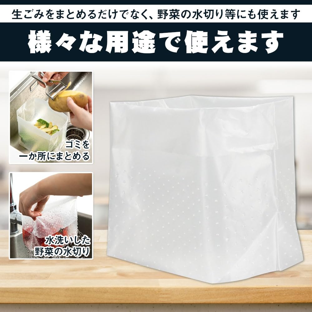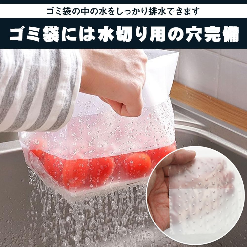 この自立式ゴミ袋は、三角コーナーを要らずに野菜屑や調理中のゴミを捨てることができます。大容量の150枚セットで、毎日こまめに交換しても長く使えます。底部に複数の排水穴があり、液体や水分が溜まりにくい仕様です。キッチンだけでなく、化粧台や洗面所にも設置可能で、使い終わったコットンやティッシュなどを捨てることもできます。半透明のポリプロピレン素材で、サイズは約25cm×10cm×18cmです。使い切りタイプのため、使用後はゴミ袋ごと捨てることができます。