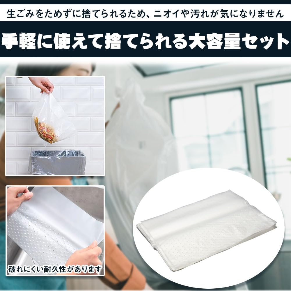 三角コーナー要らずで食べ残しや調理中に出た野菜屑などの生ゴミを捨てられる自立式ゴミ袋です。毎日こまめに交換しても長く使えるよう、大容量150枚セットでご用意致しました。
