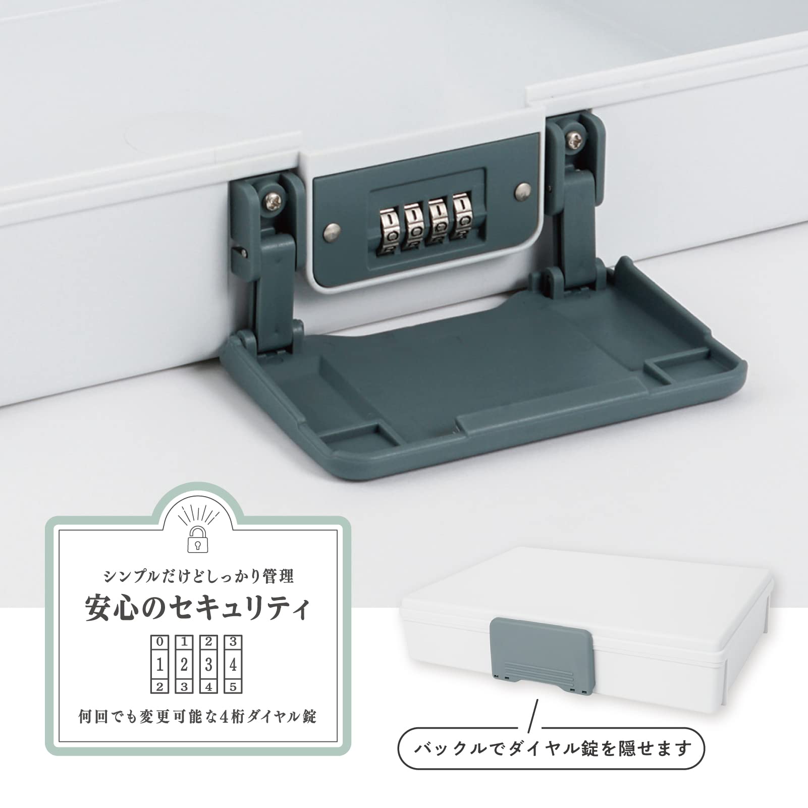 ●角形2号封筒を折らずにそのまま保管できる収納力です。●本体は軽くて取り扱いやすいプラスチック製です。●鍵の紛失の心配がない4桁のダイヤル錠です。●10,000通りからお好きな番号を何度でも設定できます。●ダイヤルで施錠しなくてもバックルを閉じることで、待ち運び時に上蓋が開くことはありません。●バックルでダイヤル部分を覆い隠せるので目に見える場所においても部屋に馴染みます。