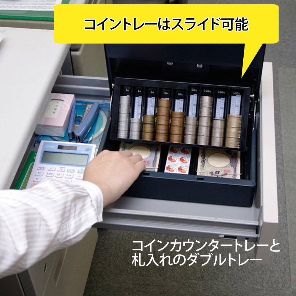 ●引き出しの中に入れて使用するのに最適な手提げ金庫です。金庫上部にダイヤルが付いているので、引き出しに入れたまま操作が可能です。コインカウンタートレーと札入れのダブルトレータイプ。また、コインカウンターはスライドして開くので見やすくなっています。シリンダー錠とダイヤル錠のダブルロックでしっかりと中身を保管し安全です。グリーン購入法適合商品です。●引き出しの中に入れて使用するのに最適な手提げ金庫です。金庫上部にダイヤルが付いているので、引き出しに入れたまま操作が可能です。コインカウンタートレーと札入れのダブルトレータイプ。