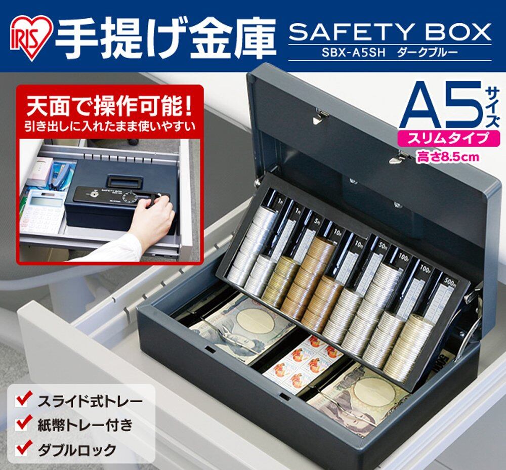 【在庫処分】アイリスオーヤマ 金庫 手提げ金庫 ダイヤル式 ダブルロック A5 天面操作 ダブルトレー SBX-A5SH ダークブルー
