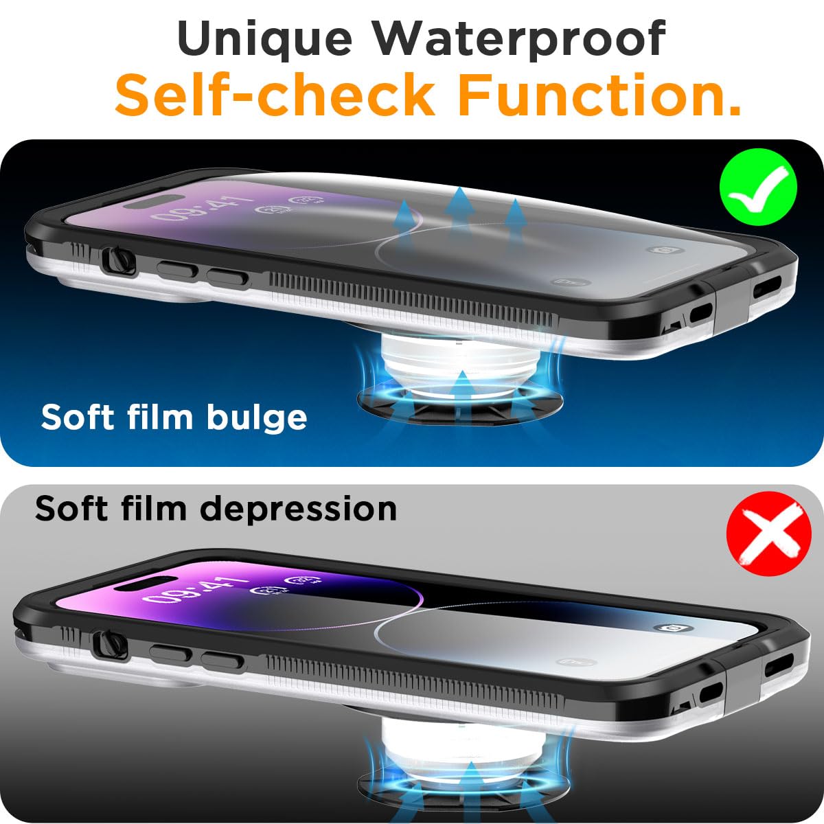 便利なセルフチェック機能:長年の研究と改善の後、私たちはついに市場でユニークなこのセルフチェックの防水電話ケースを開始しました。電話ケースの背面にセルフチェックアクセサリーがあります。 電話ケースが水に入る前に正しく設置されているかどうか、より自信を持って水中写真を撮ることができます