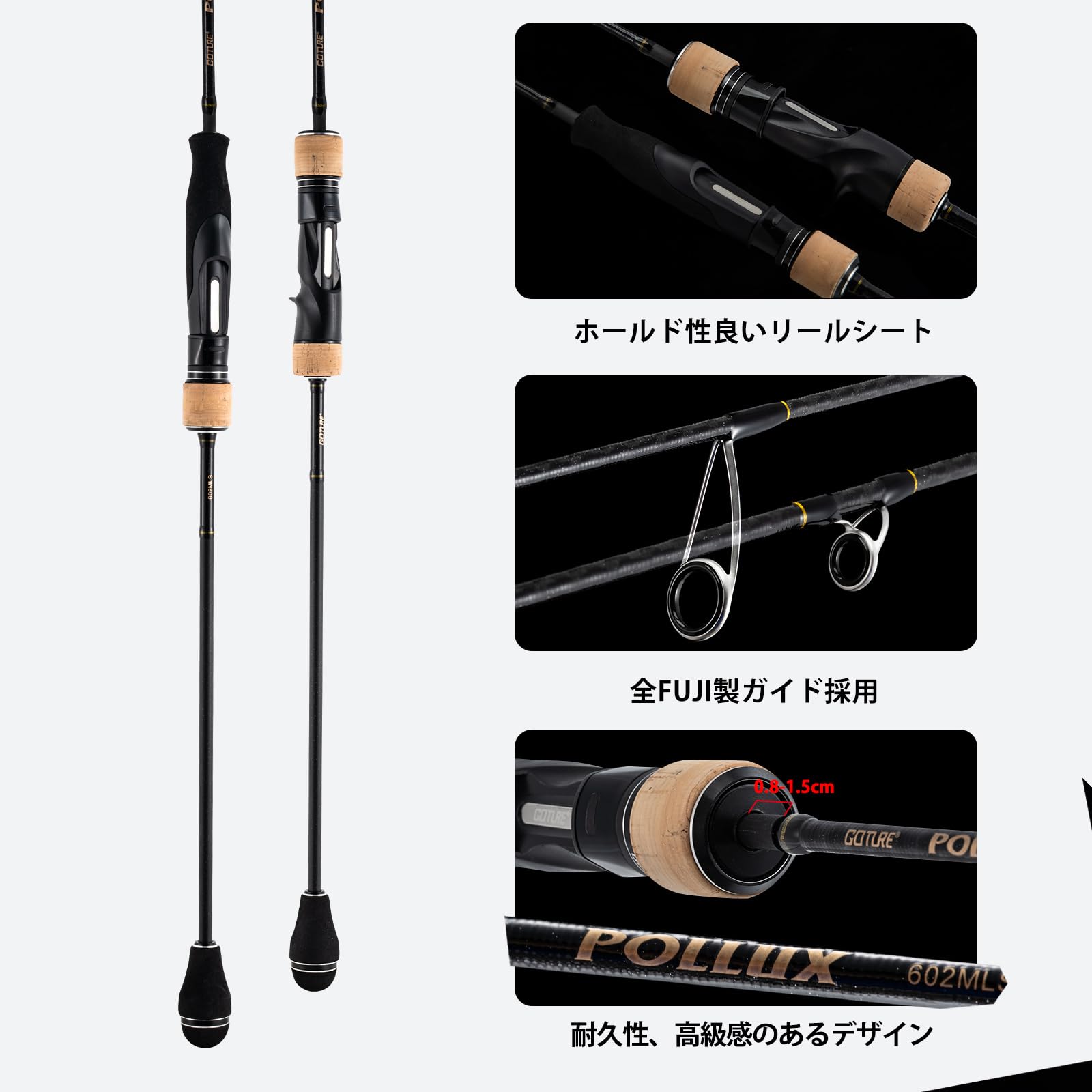 【グリップ脱着式】センターカットでの2ピーズではないので、2ピーズ欠点であるだるさなどを感じず、ロッドの全体的な特性を可能な限り保ったまま、持ち運びしやすいようにします。グリップ脱着式は美しい曲がりを実現でき、丈夫ではがれにくいです。※接続部に1-2cmの長さをとっておくことで、竿の寿命を延ばしてくれます。