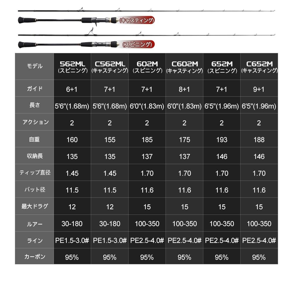 ルアー荷重(g):30-180g;PEライン(号):1.5-3.0#.