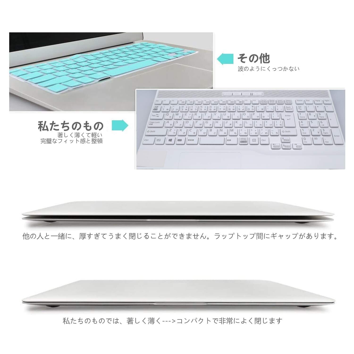 【超薄型】極めて透明に近い且つ薄い、僅かに0.15mm、気付かれないほど薄く、カバーを付けていても違和感のないタイピングを実現できます。夜間でも、キーボードの字がはっきりと見えます。もちろん、カバーを付けたまま閉じられます。