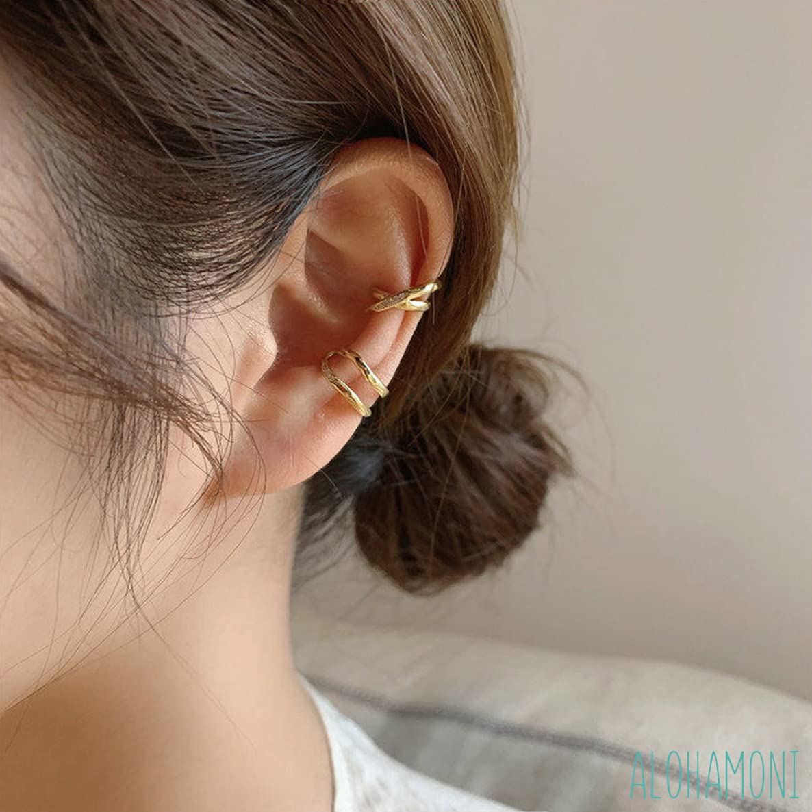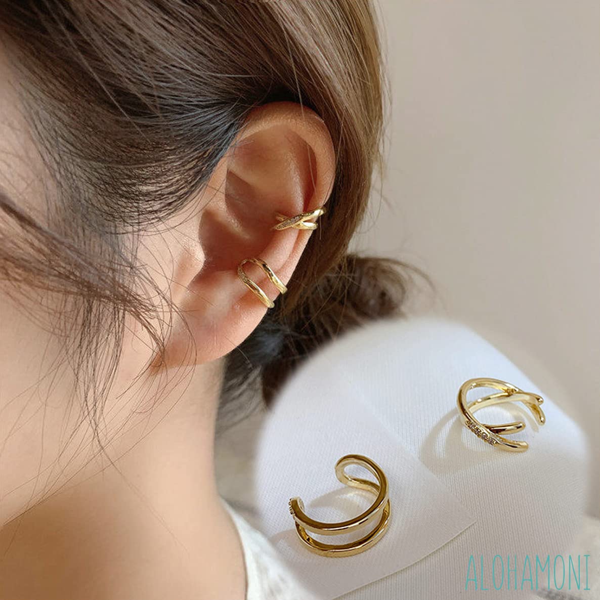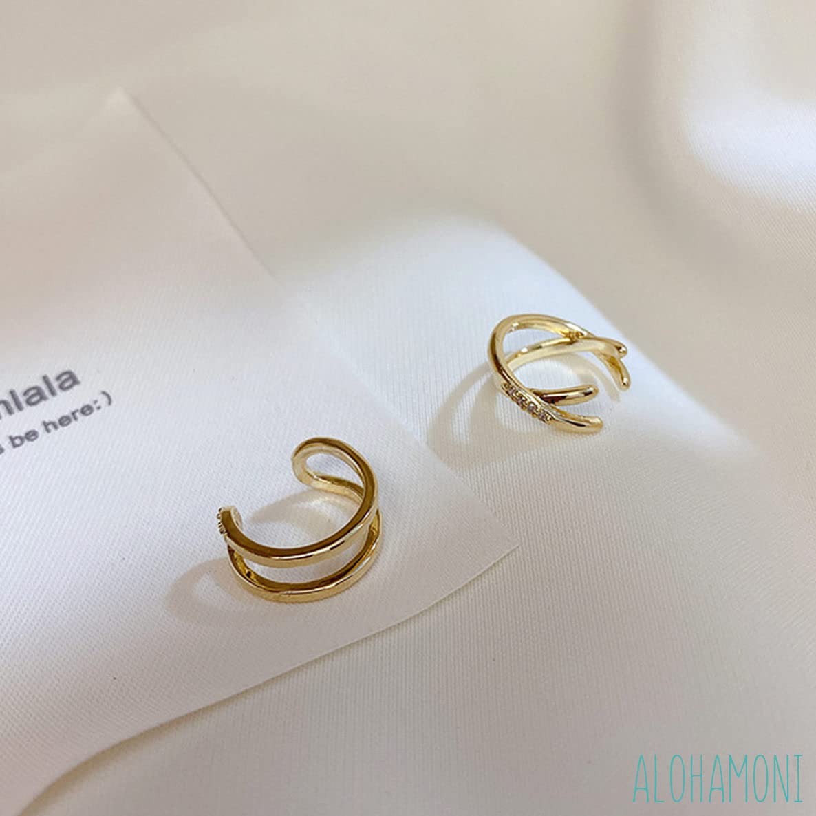 ALOHAMONI (アロハモニ) イヤーカフ クロスリング & 2連リング ラインストーン ゴールド フェイクピアス クロス 十字 平行 2連 U字型 両耳 片耳 2個セット 韓国 オルチャン