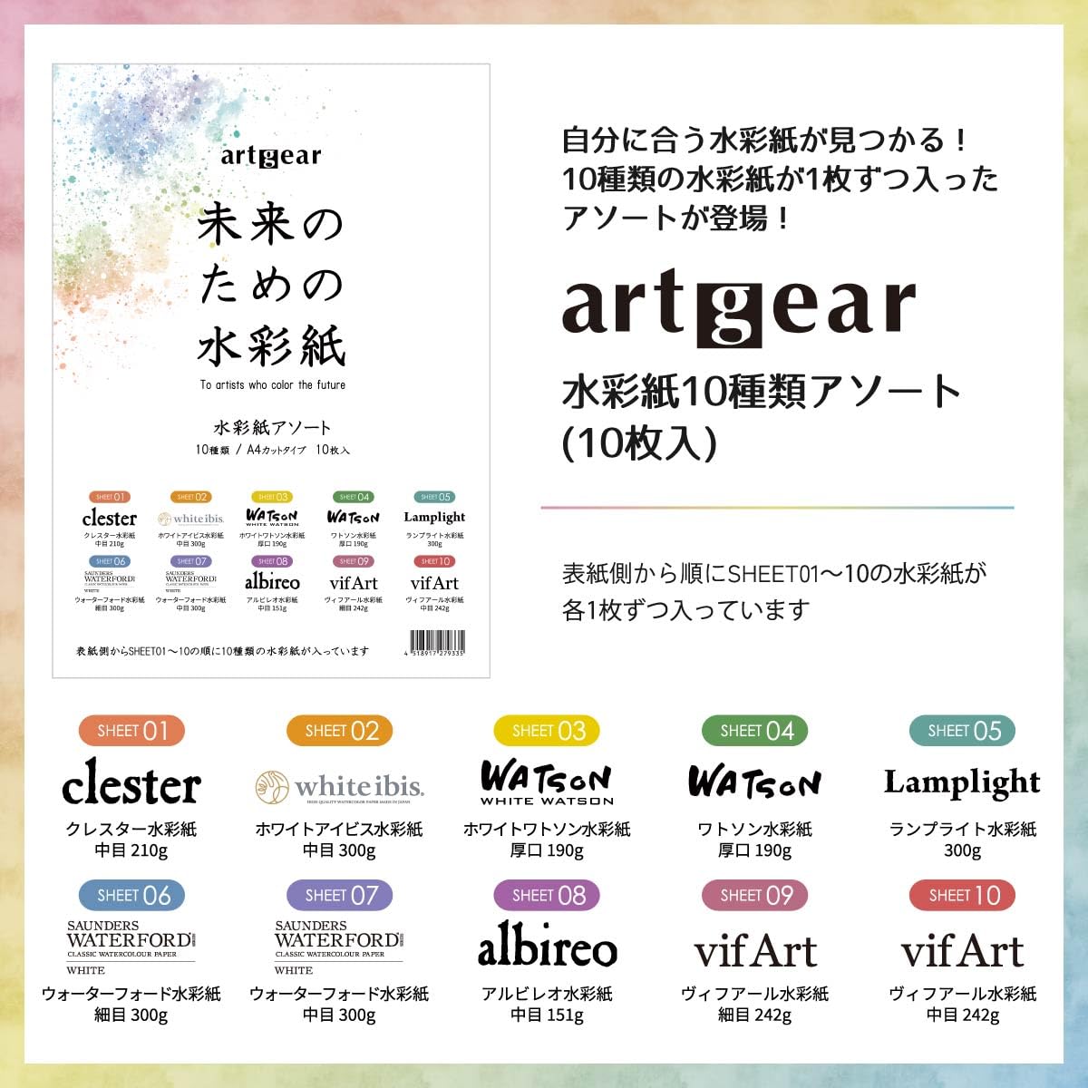 artgear 未来のための水彩紙 A4 10枚 10種アソートセット (agp100) 10種類各1枚セット A4規格 10枚入 ブランド artgear 色 ホワイト 材質 アソートセット シートサイズ 210 x 297 ミリメートル 紙の仕上げ 水彩紙