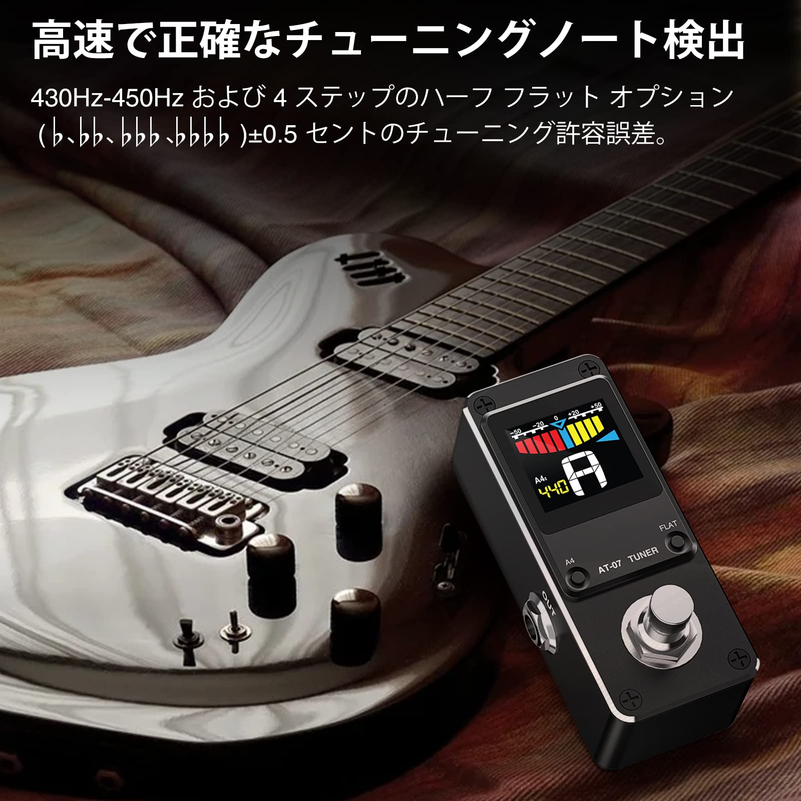 ??【ピッチ&ハーフフラット】A4ピッチボタンを使用すると、チューナーペダルを使用して、430Hzから450Hzの範囲でキャリブレーションピッチを変更できます。 このペダル チューナーには、♭、♭♭、♭♭♭、♭♭♭♭ の 4 つのステップを備えたハーフ フラット オプションがあり、ノート フラットでチューニングできます。??注意:購入日から1年間の日がありますので、ご不明な点がございましたらお気軽にお問い合わせください。品質に問題がある場合は交換可能です。