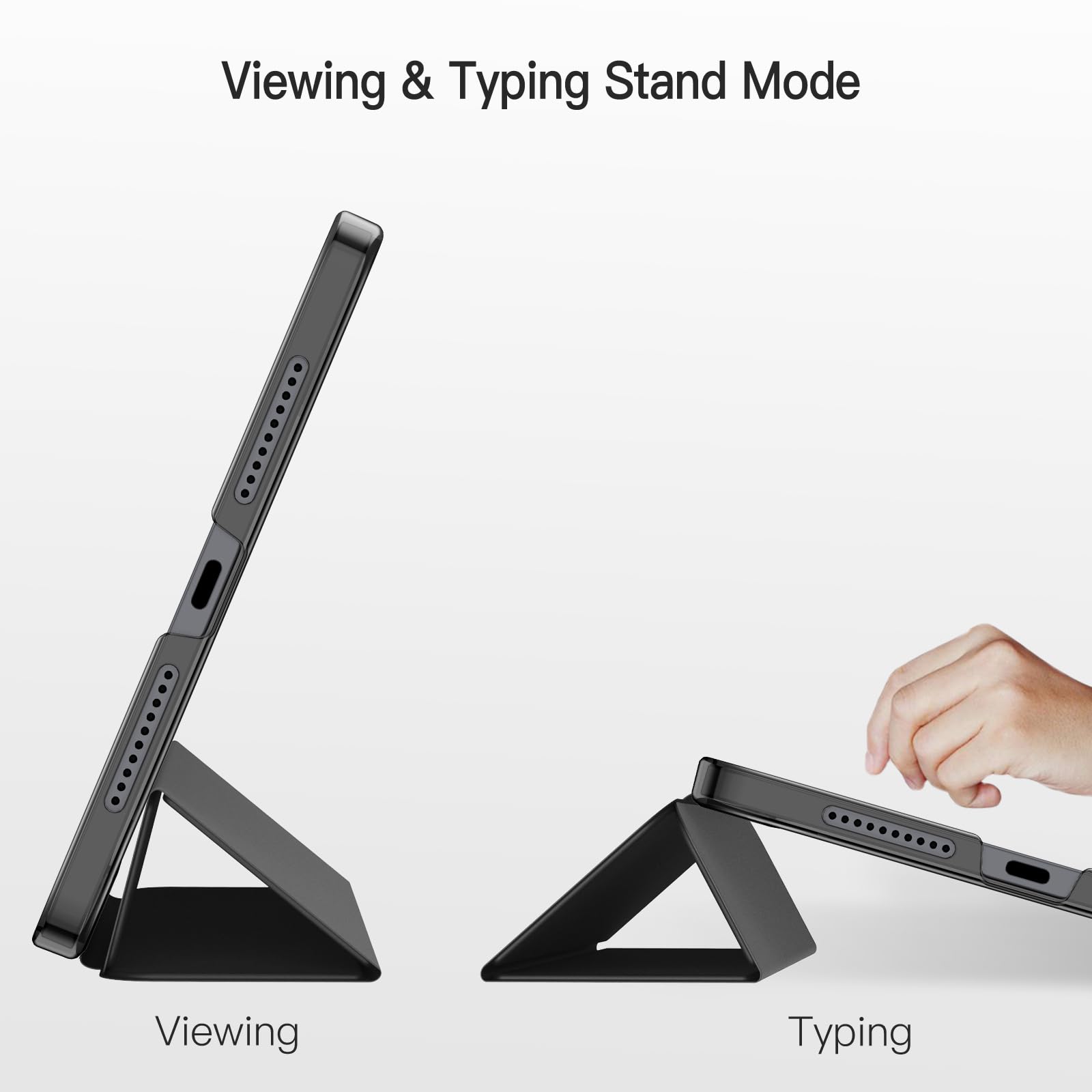 マグネット内蔵、オートスリープとオートウェイクアップ機能が付きます。三つ折りフロントカバーにより、視聴とタイピングに合わせた2つスタンド角度を調整できます