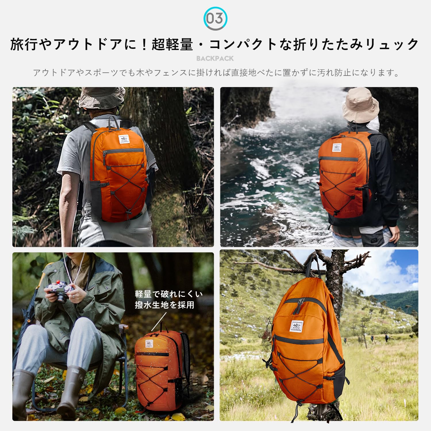 ?【アウトドアバックパック】折り畳みリュックはバックホケットに撥水加工が施されている生地、濡れたらタオル等で拭いていただくだけで、数十秒〜数分で元の状態に戻ります。(※豪雨の場合耐水性が足りない)全4色あり、出張や旅行に楽しみ、折り畳み式で、いつでも簡単で収納できます。