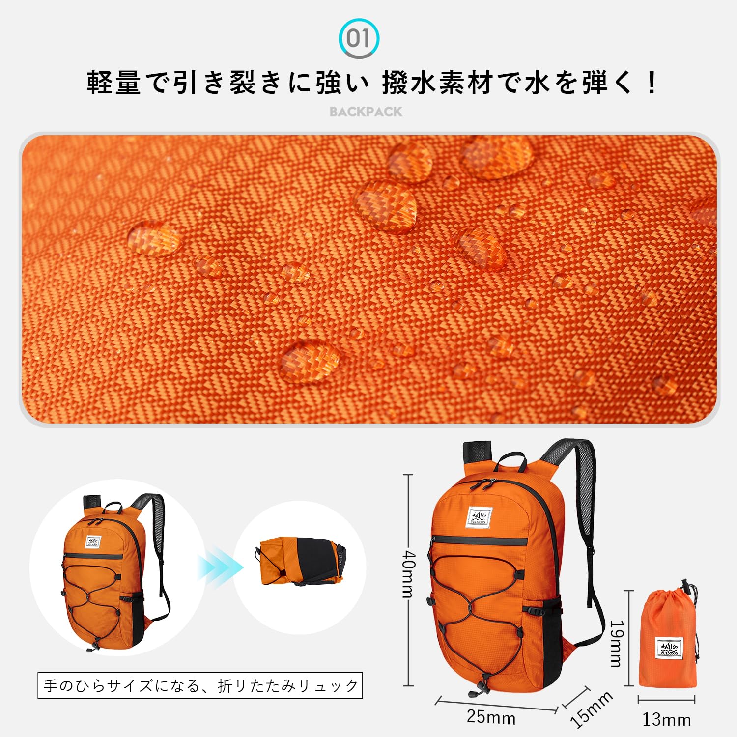 【在庫のみ】[Vulmoon] 折り畳み アウトドア 折りたたみ リュック 15L 防水 軽量 163g 旅行 収納袋付き 男女兼用