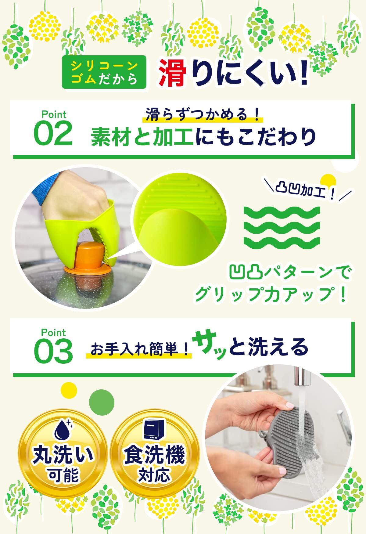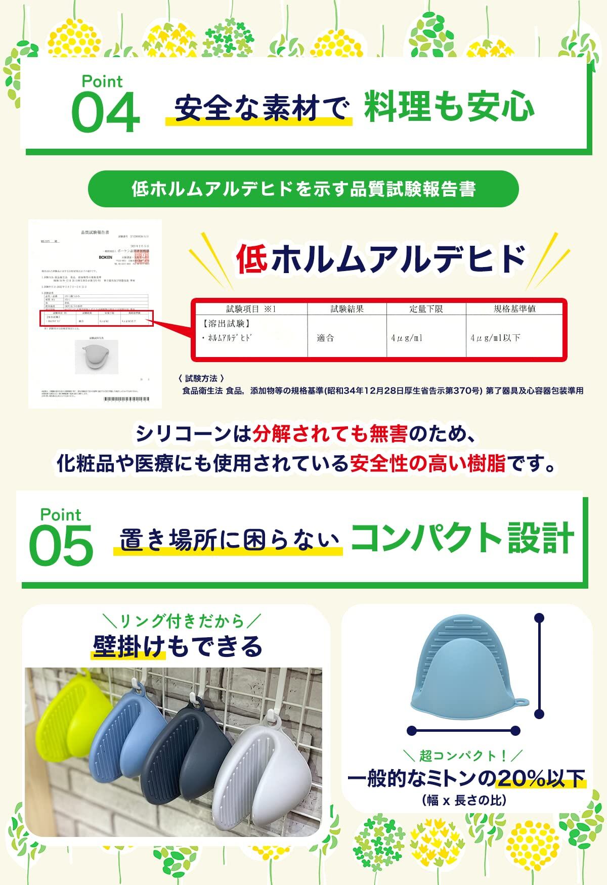 【コンパクトなのにしっかり耐熱】シリコーン素材で耐熱性を備えています。シリコーンは熱伝導性が低く、熱を通しにくいため高温の鍋や食器を持つときにも手を守ってくれます
