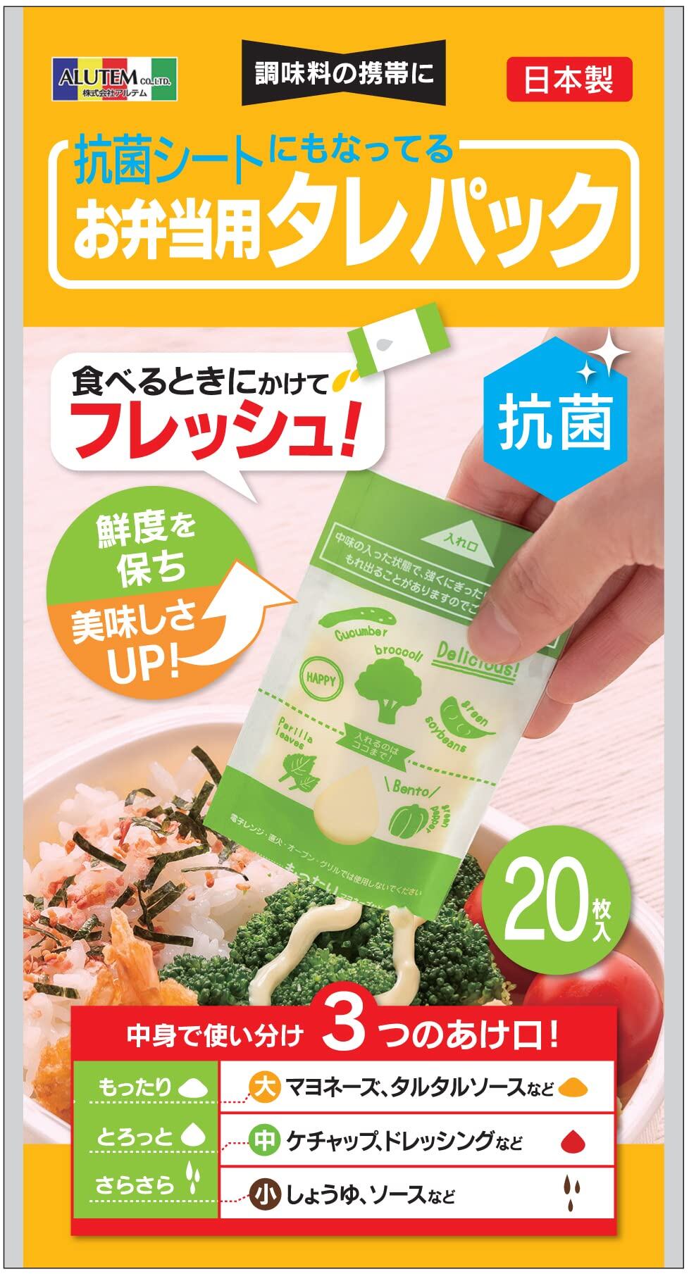 ●タレビンと抗菌シートの機能がひとつになった「抗菌シートにもなってるお弁当用タレパック」です。●銀イオンの効果で抗菌シートになっています。●調味料の携帯し、抗菌作用でお弁当をガードします。●調味料を食べる直前にかけることができるから新鮮です。●調味料の粘度により、3つの切り口を使い分けできます。●上部の注ぎ口から入れるだけなのでとても簡単です。●使い捨てなので衛生的で時短になります。【ご使用上の注意】●電子レンジでのご使用は出来ません。●耐熱・耐冷温度:70℃・-50℃