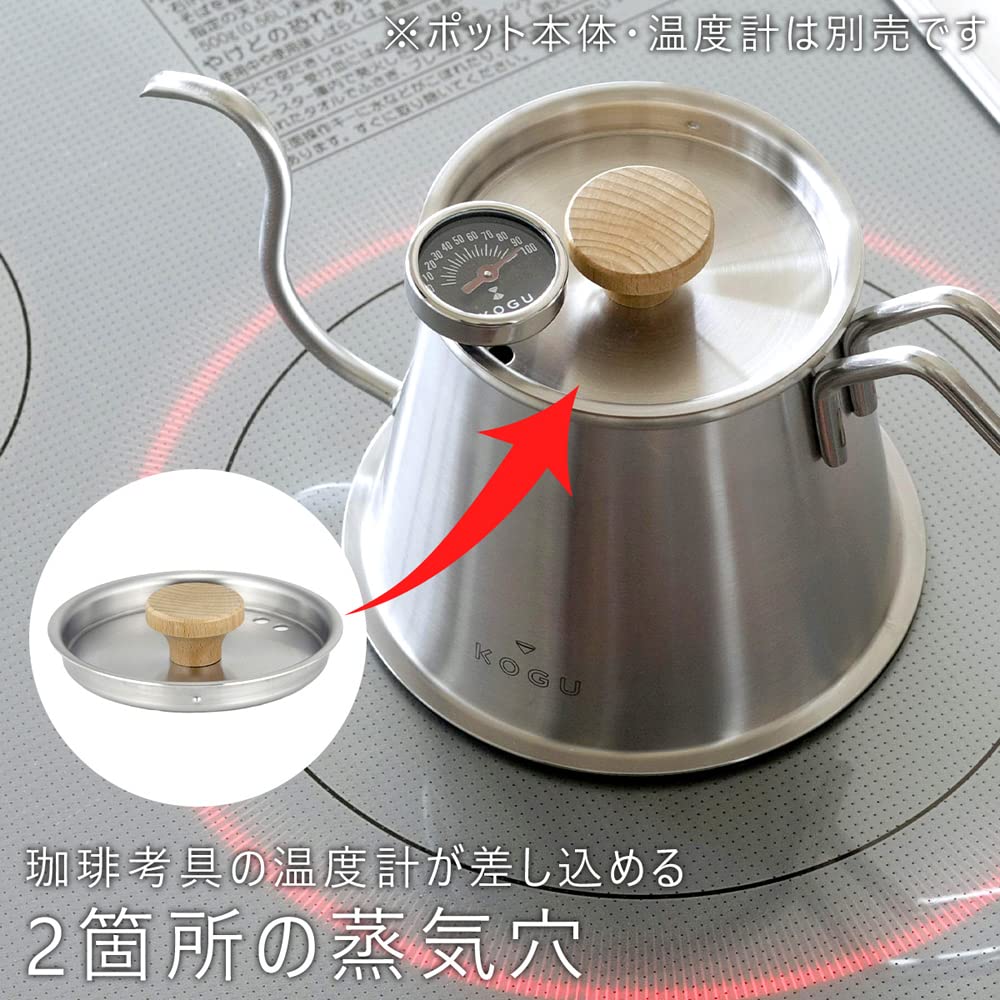 蒸気穴が2つあるので、1つの穴に「珈琲考具 温度計」(別売り) を差して使用することもできる