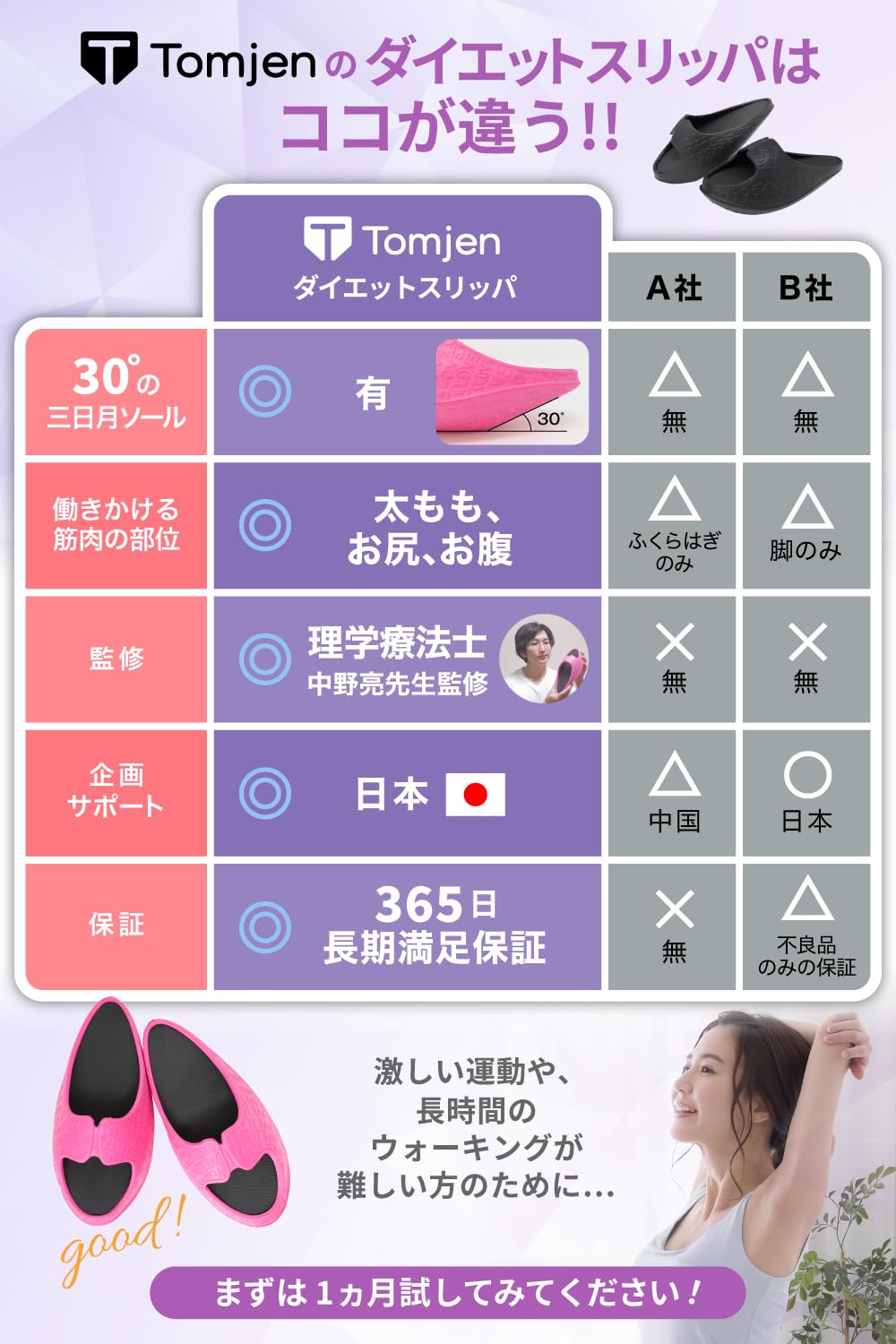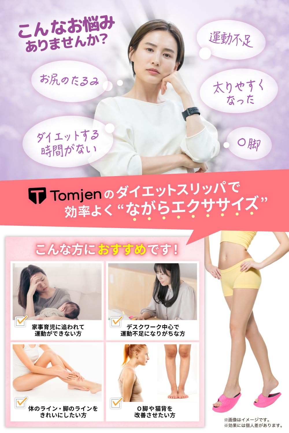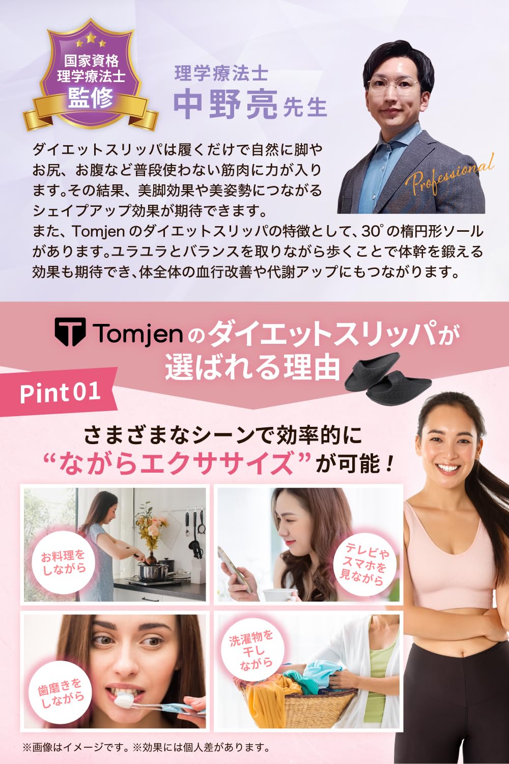 ?【国家資格の理学療法士監修】Tomjenのダイエットスリッパは、多くのお客様の身体のお悩みをサポートしてこられた理学療法士の中野亮先生が監修。履くだけで自然に脚やお尻、お腹など普段使わない筋肉に力が入り、その結果、美脚効果や美姿勢につながるシェイプアップ効果が期待できます。 ?【さまざまなシーンで効率的に、ながらエクササイズが可能】Tomjenの健康スリッパはお料理をしながら、テレビを見ながら、歯磨きをしながら…時間に余裕がない方でも履くだけで効率的にエクササイズができるズルい燃焼スリッパです。 ?【計算された楕円形の30゜三日月ソールで体幹トレーニング】ダイエットサンダルの靴底が不安定なことにより、履くだけでユラユラとバランスをとる体制になります。その結果より高い脂肪燃焼効果が期待でき、メリハリボディを目指せます。 ?【脚が引き締まる美脚、くびれのある美姿勢、ヒップアップを同時に目指せる】多くのダイエットスリッパはふくらはぎだけ、あるいは太ももまでの働きかけにとどまってしまうものが多い中、当製品は脚全体はもちろん、お腹や腰回りの筋肉にも働きかけるので、身体全体に自然と力が入りやすくなる仕様となっております。 ?【日本人スタッフの安心サポートと満足】日本人による企画・販売で365日の長期満足付きだから安心。気になることがございましたらいつでもご連絡ください。日本人スタッフが誠心誠意対応させていただきます。