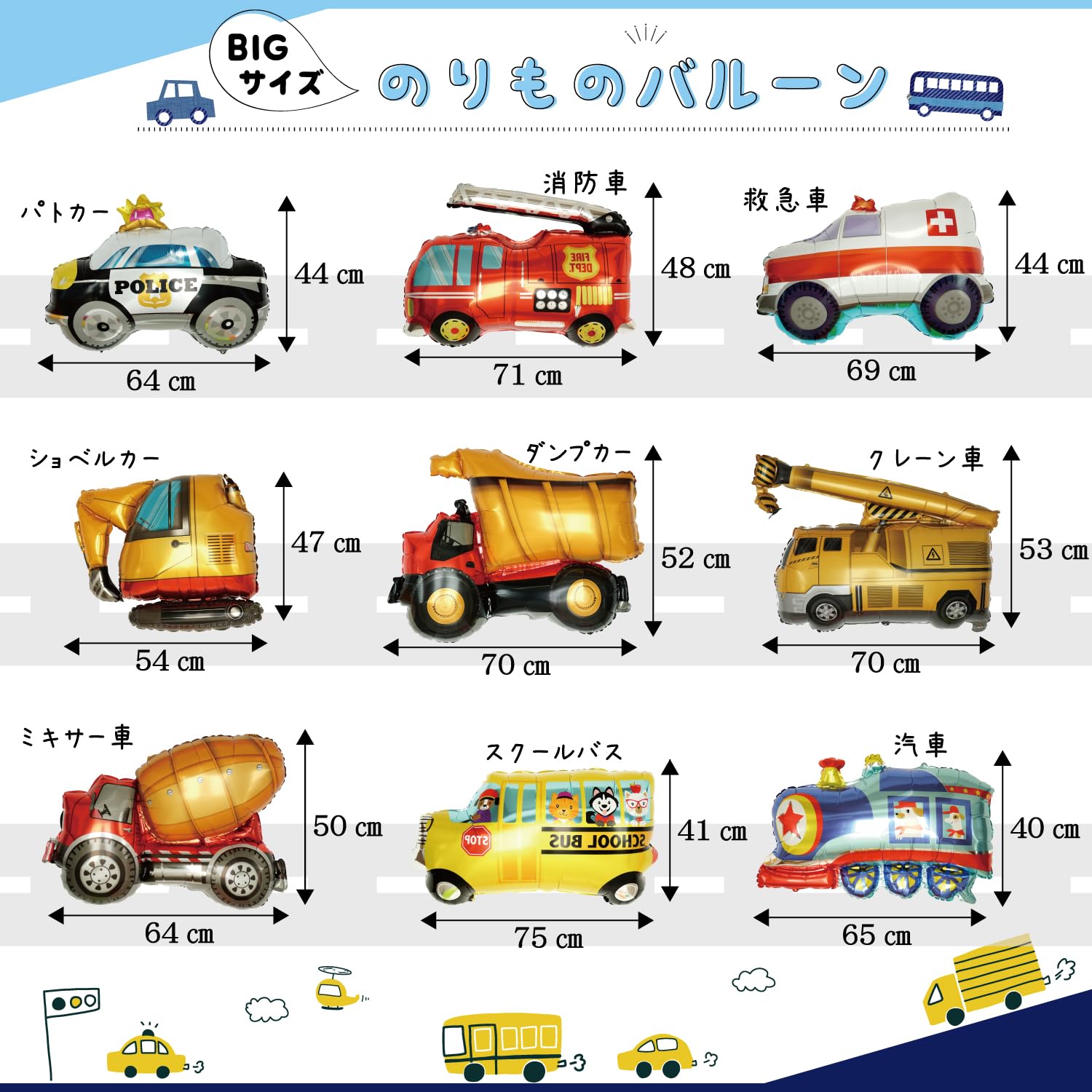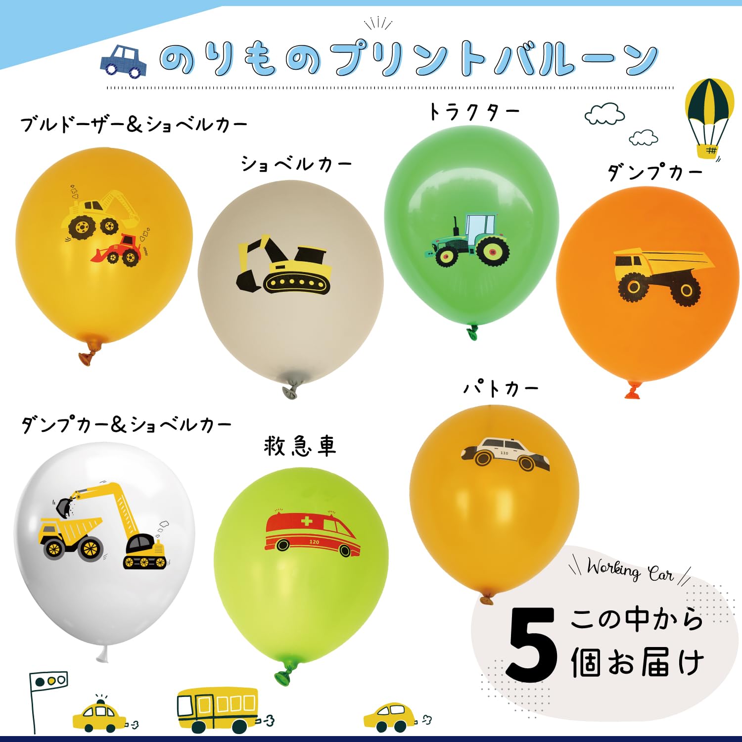 【大きいサイズの乗り物バルーン】パトカー、消防車、救急車、ショベルカー、ダンプカー、クレーン車、ミキサー車、スクールバス、汽車の9種類入り!働く車がプリントされたゴム風船も入ったかわいいセットです♪カラフルで華やか、人気のフィルムバルーンが厳選された飾りセットです。