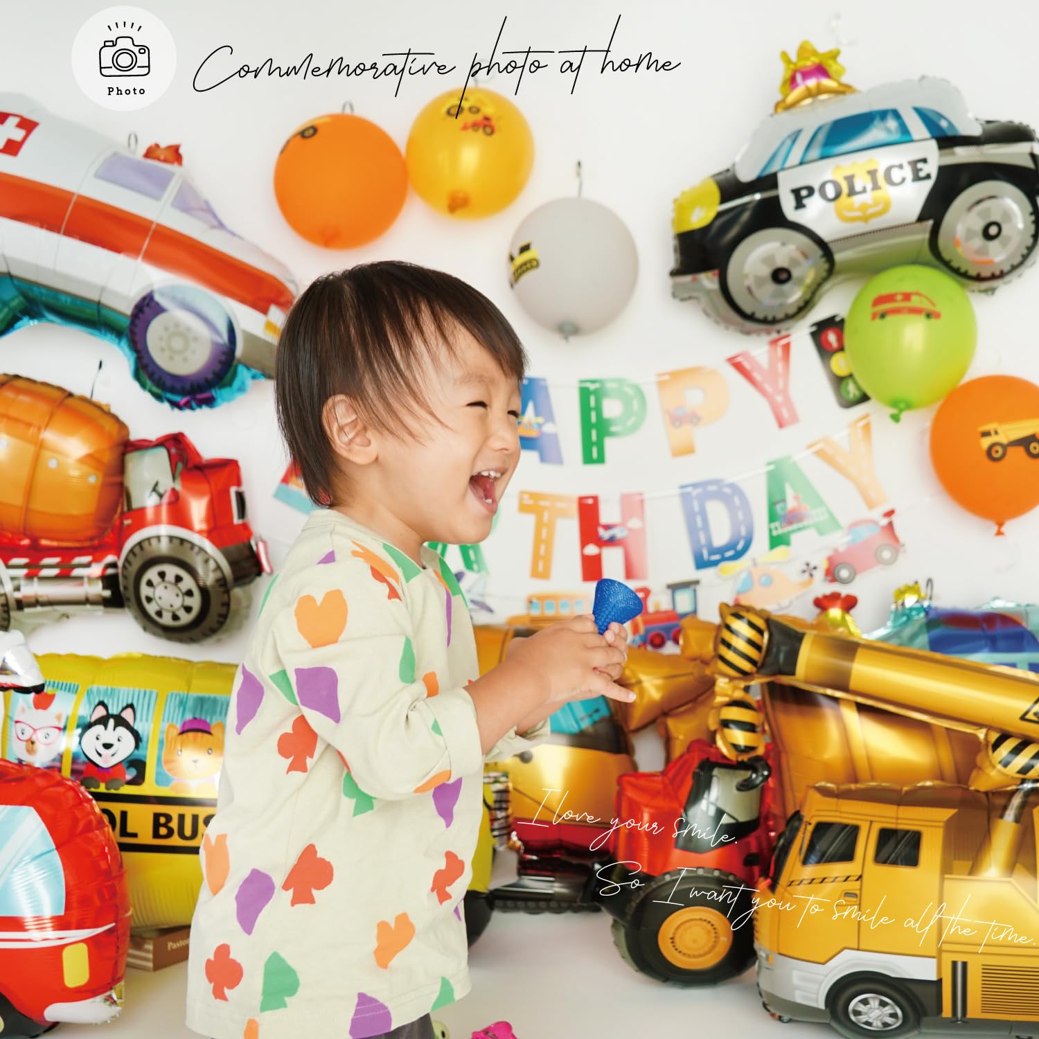 【お子さまの誕生日におすすめ!】大きいサイズの乗り物バルーンがかわいい働く車誕生日飾り付けセットです!HAPPY BIRTHDAYガーランドやパトカーなどの働く車がプリントされたゴム風船など、このセットだけで華やかなお誕生日の飾り付けが完成します。男の子も女の子も大喜びすること間違いなしの乗り物誕生日飾りセットです☆