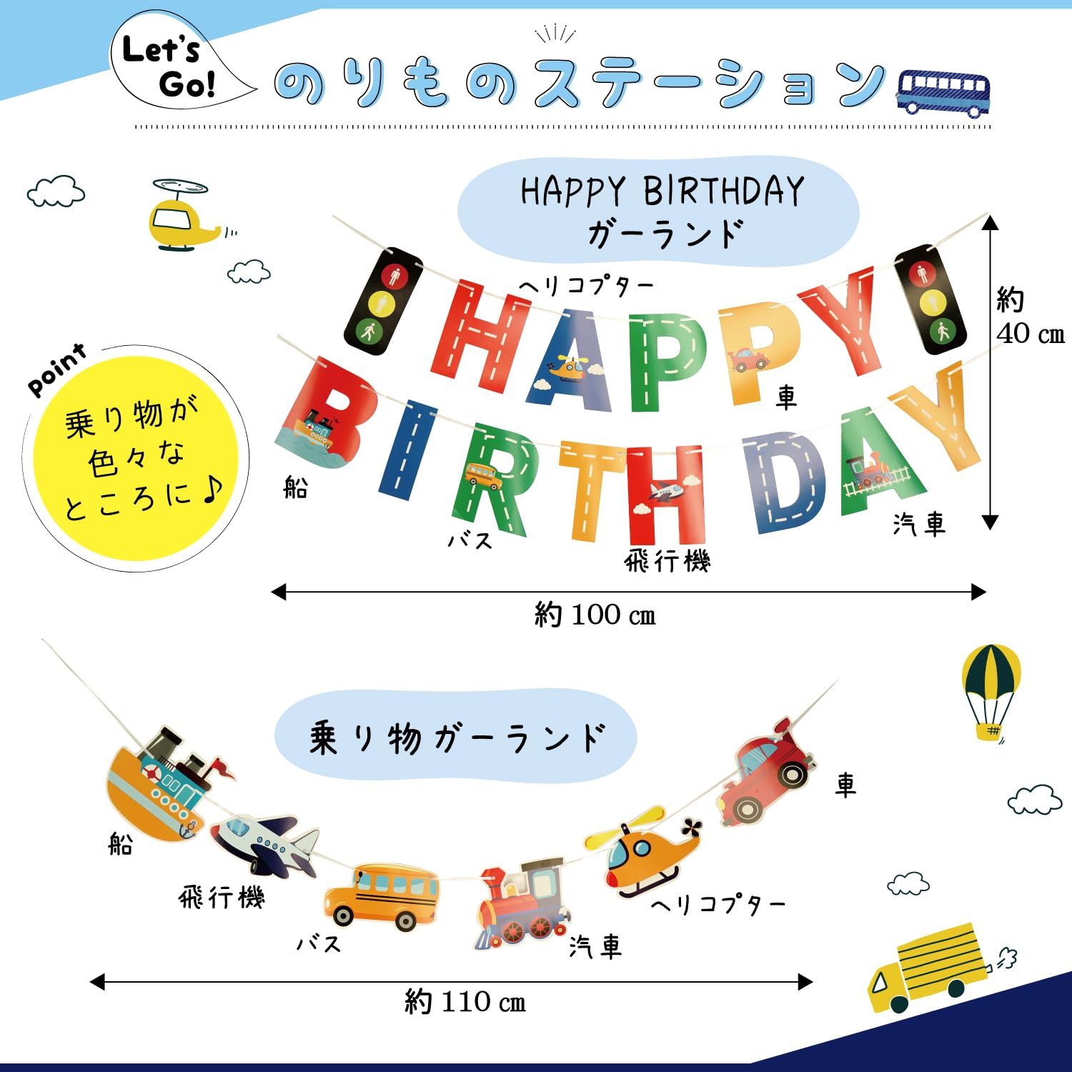 【17点セット内容】HAPPY BIRTHDAYガーランド×1、乗り物ガーランド×1、乗り物バルーン×9種類、乗り物プリント風船×5、両面シール×1セット ※サイズ等詳細につきましては商品の説明をご覧ください。