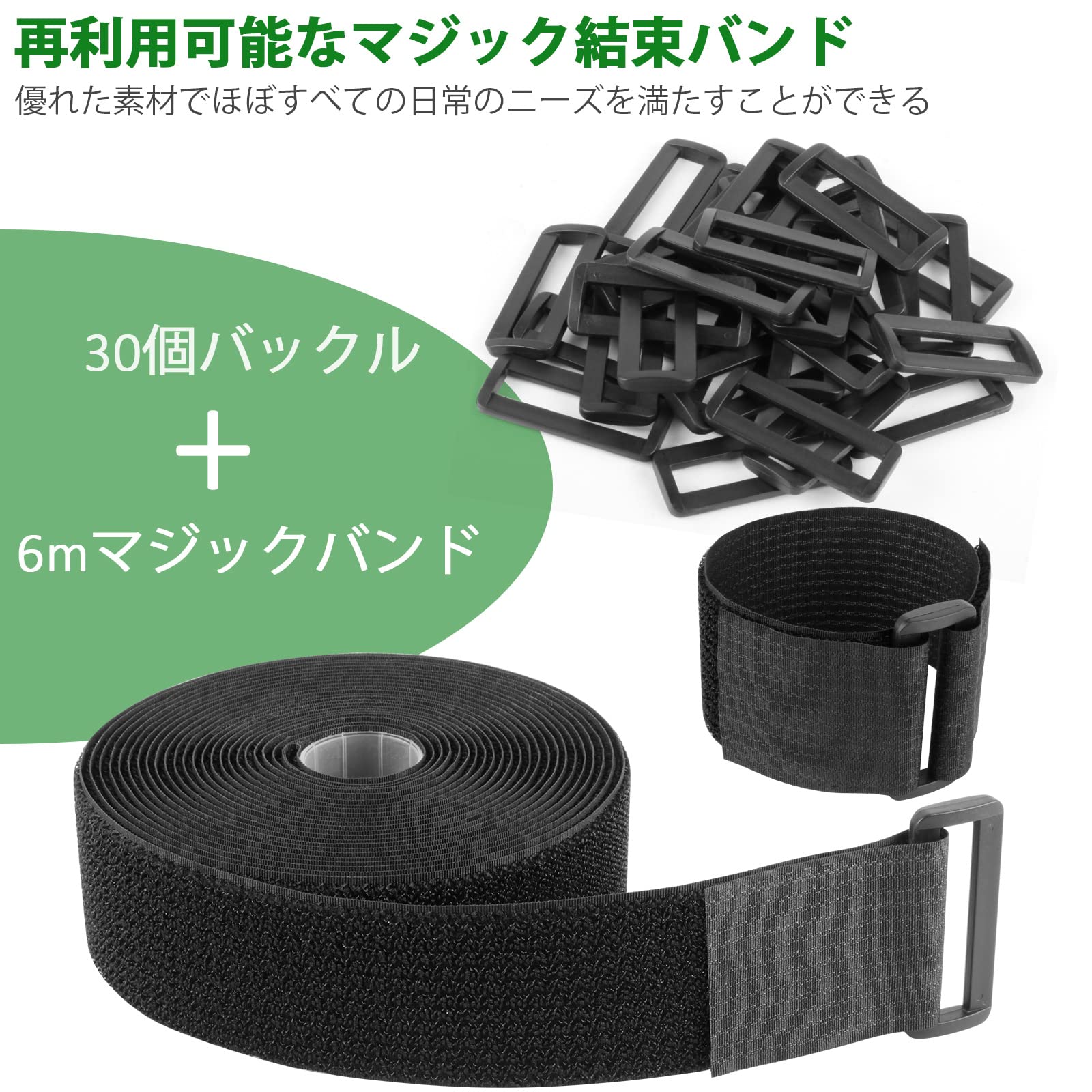 マジック結束バンド 面ファスナー 長さ6m*幅5cm 30個バックル付き 荷締めベルト ベルクロ 耐熱 自由にカット 繰り返し 荷物梱包 収納用テープ DIY用 業務用 家庭用 工業用 (5cmx6m)