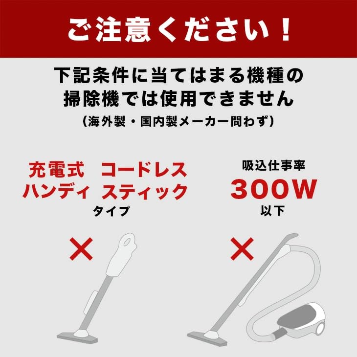 ※適応掃除機:コード式で吸込み仕事率[300w以上]の掃除機。ハンディタイプ、スリムタイプ、充電式の掃除機はお使いいただけません