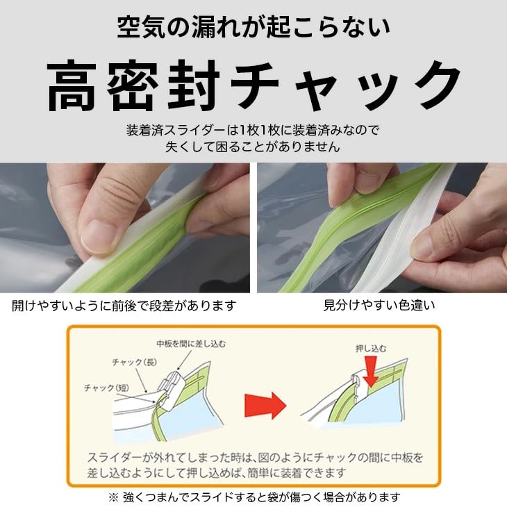 ※空気が入ってしまうときは、固く絞ったタオルなどでチャックを拭いてから、端がたるまないようチャックを閉じてください。改善しない場合はお問い合わせください。