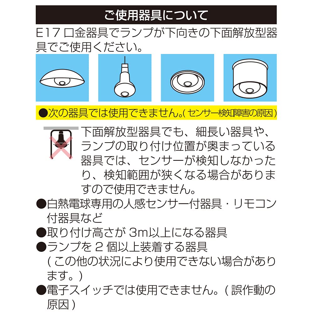 ※次の器具では使用できません(センサー検知障害の原因) ・下面解放型器具でも、細長い器具や、ランプの取り付け位置が奥まっている器具では、センサーが検知しなかったり、 検知範囲が狭くなる場合がありますので使用できません ・白熱電球専用の人感センサー付器具・リモコン付器具など ・取り付け高さが3m以上になる器具 ・ランプを2個以上装着する器具(この他の状況により使用できない場合があります) ・電子スイッチでは使用できません(誤作動の原因)