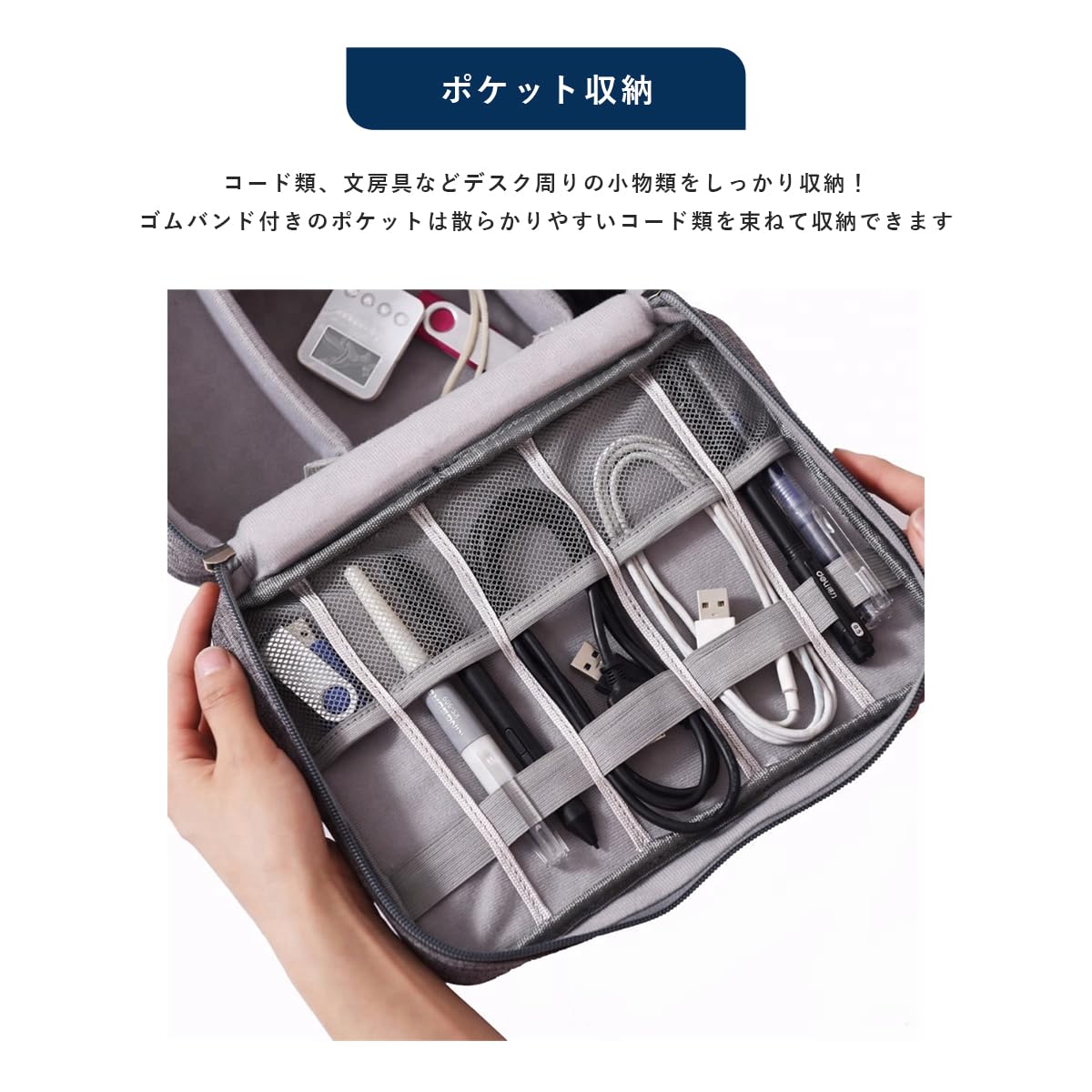 充実の収納スペース。ケーブル、バッテリー、マウスなどかさばるガジェット類をすっきり収納◎ コード類やタップ、文房具などデスク周りの小物をすっきり! メッシュポケットは中身が見やすく、ゴムバンドはコードを束ねるのに◎ 仕切り部分はマジックテープがついており、自由にレイアウト可能。