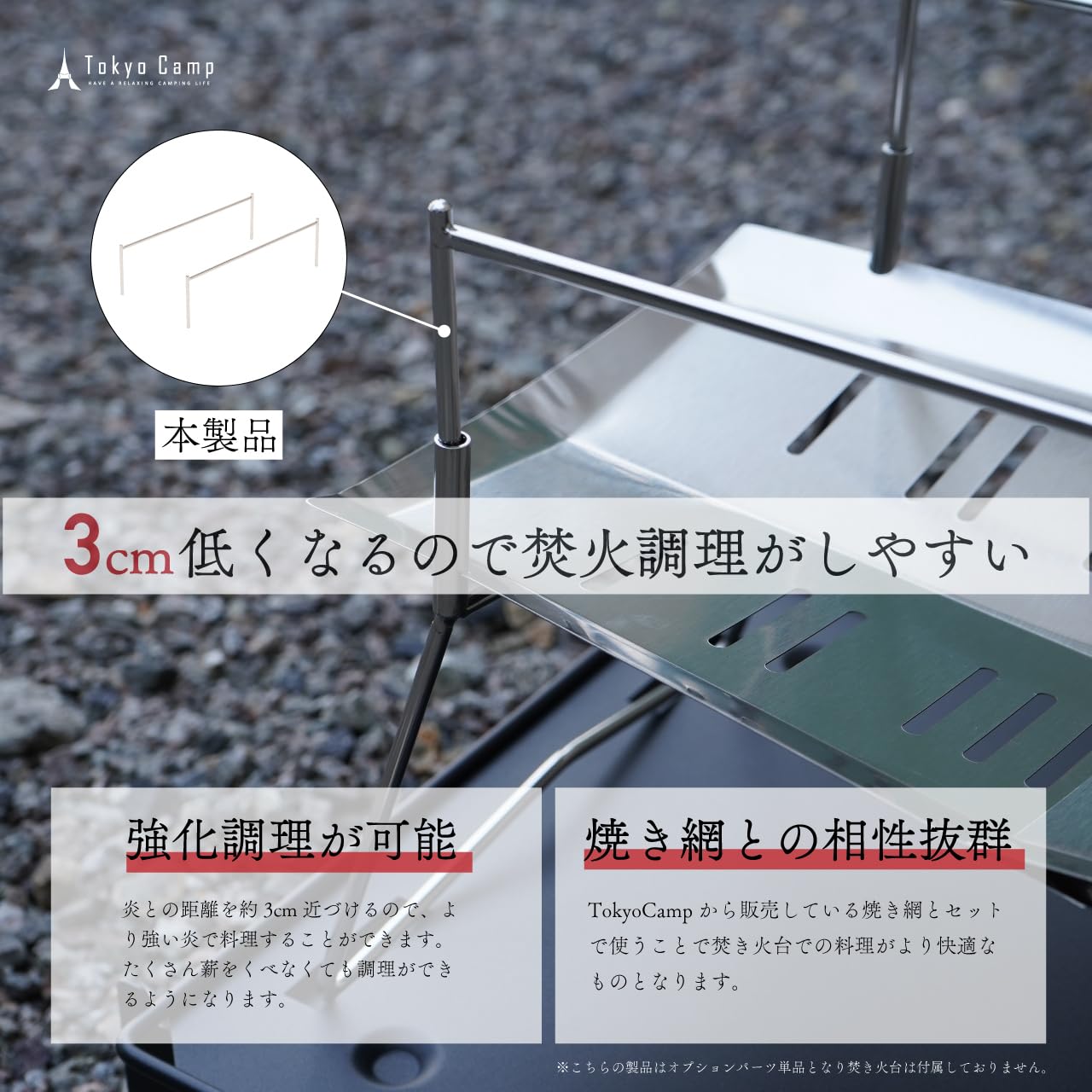 【 オプションパーツ 】 調理の際、炎との距離を約3cm近づけられ、より 焚火 飯や アウトドア クッキングの幅を広げられるものとなっております。
