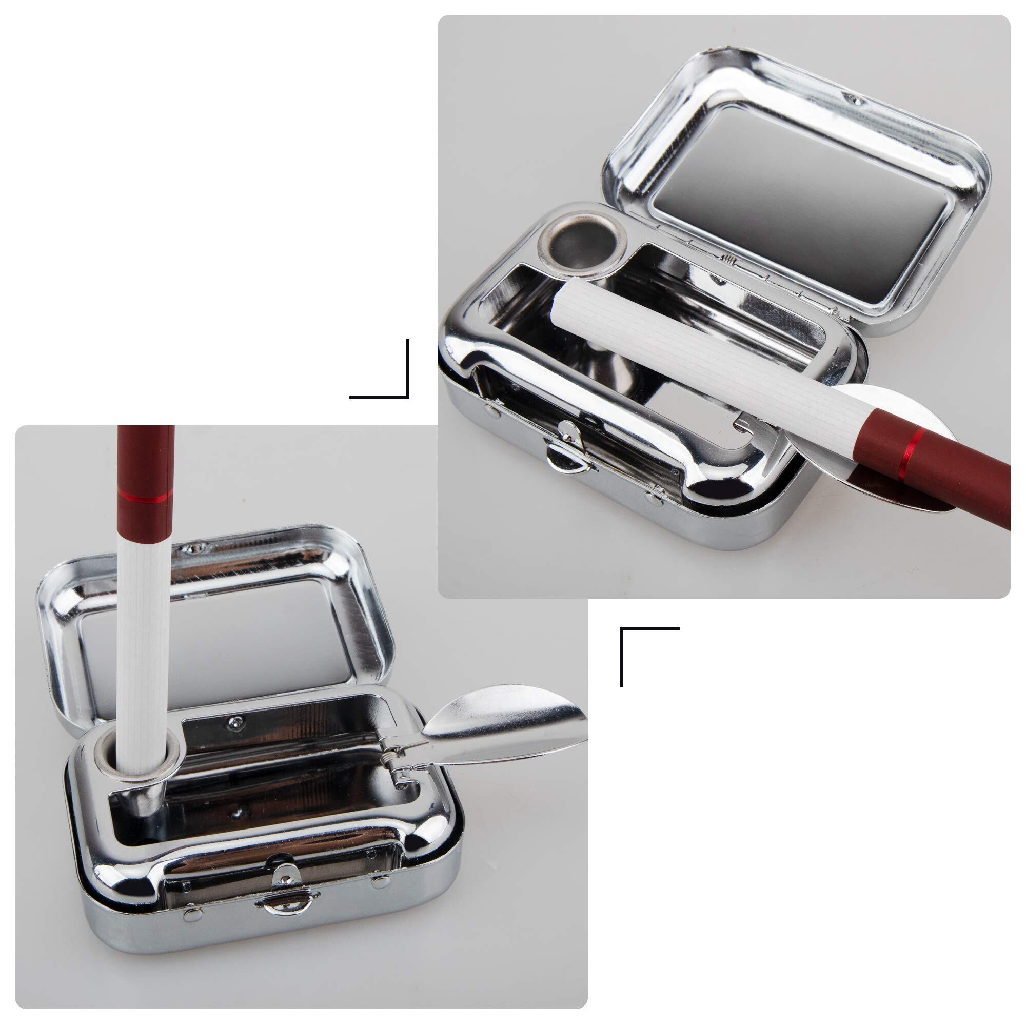 【使用簡単】ボタンを押して、携帯灰皿を開けます。また、タバコ置きところは二つあり、その中で一つはタバコの火を消す機能もあります。