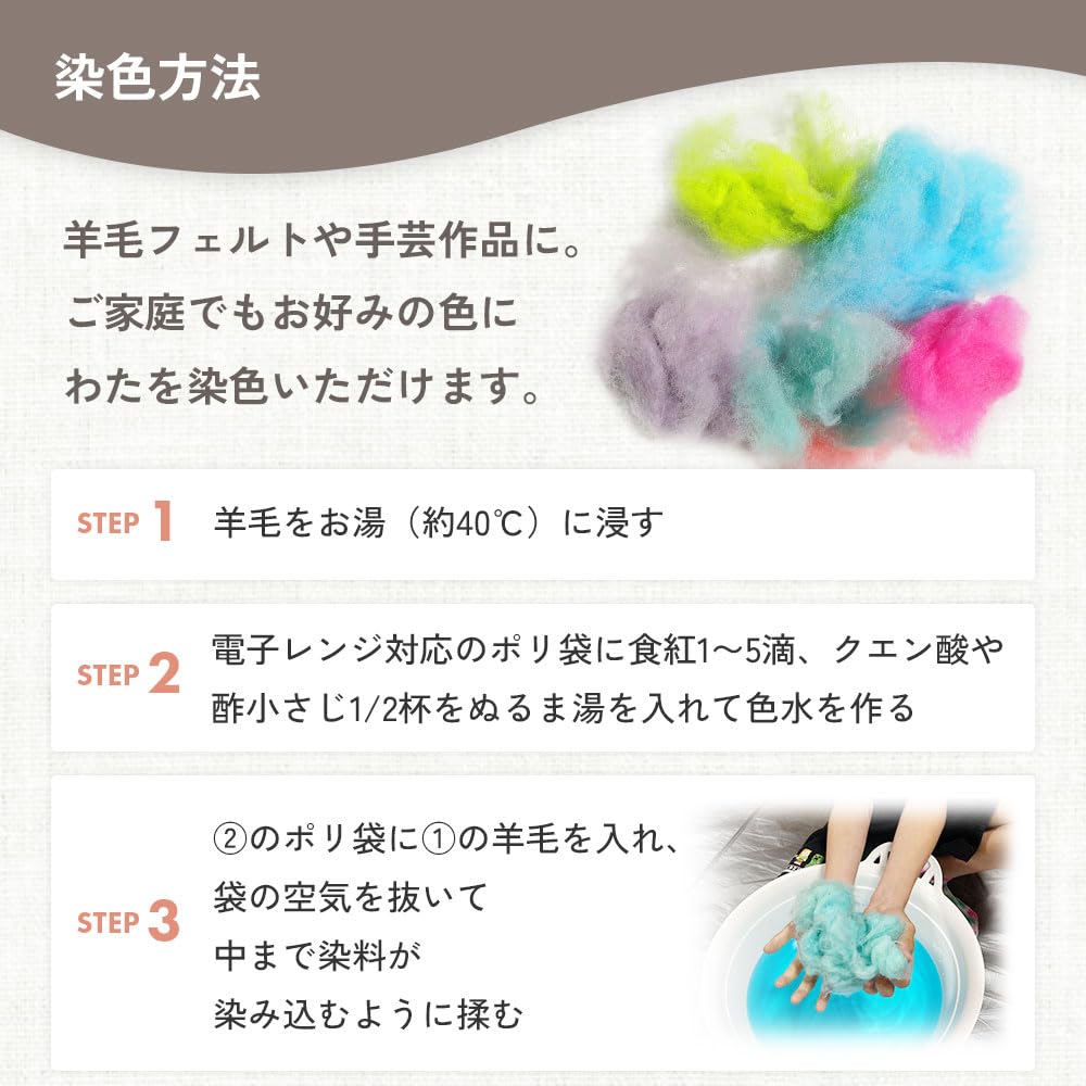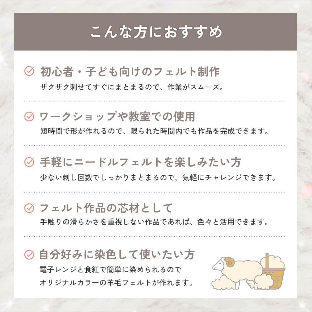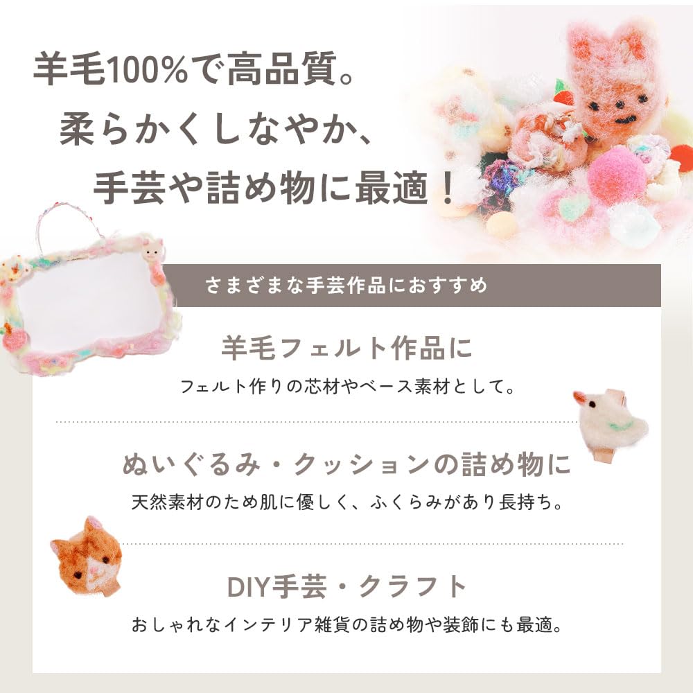 ■羊毛シート・高品質のフランス羊毛100%。嫌な臭いの少ない高品質のフランス産の羊毛を使用しています。油脂分、弾力性、繊維の長さ等の検査基準をクリアしたゴールドラベル付のウールです。その羊毛を眠り姫で成形しています。品質付きで安心してご使用いただけます。(日本製)※天然繊維ですので、若干異物が混ざっている場合もあります。あらかじめご了承願います。・加工しやすいシートタイプ。羊毛を成形後シート状に仕上げています。ニードルを軽くさすだけでまとまりやすくほどよい硬さ仕上がります。電子レンジと食紅で簡単に染色できるので、そのままカラフルな作品が作れます。アホ毛(飛び出し毛)も少なく、綺麗にまとまります。 手芸綿としてだけでなく、ちぎれやすく、扱いやすいので、いろいろな中綿にも使用できます。