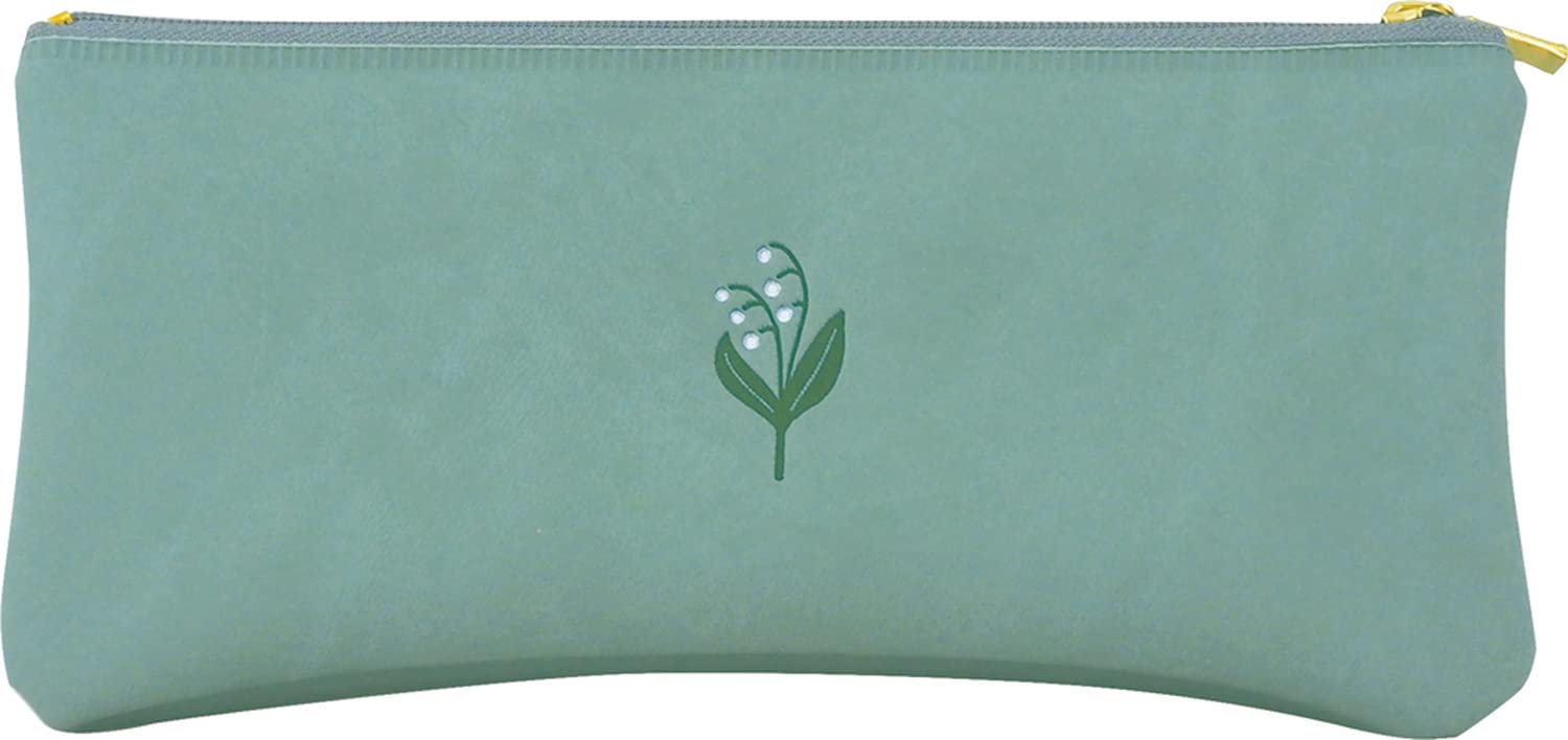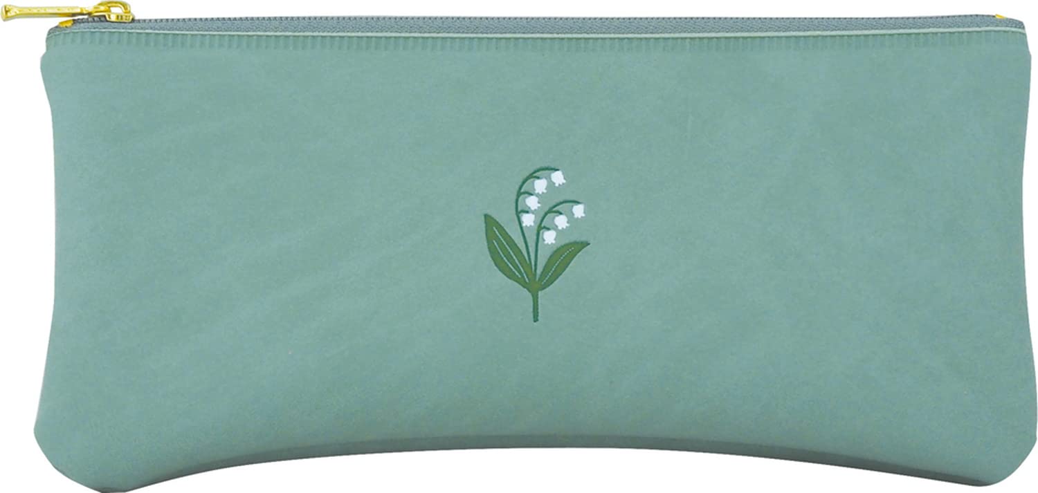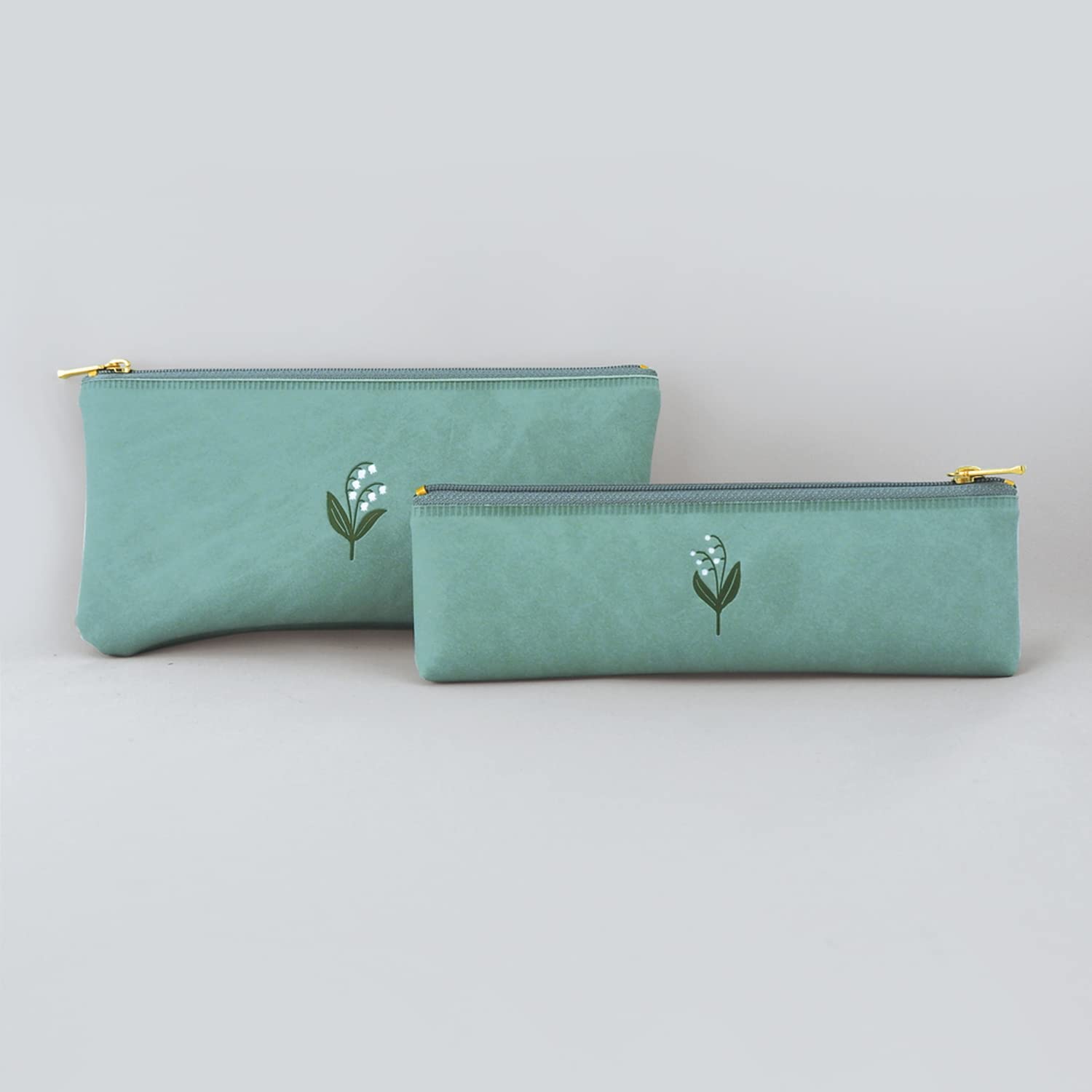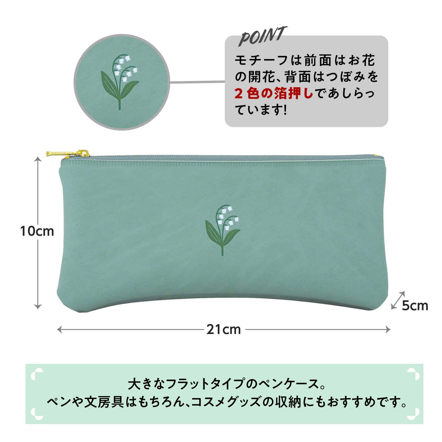 人気のお花を両面に2色の箔押しであしらった、スリムタイプのペンケース。それぞれ全面は開花、背面はつぼみをモチーフにしています。1色ペンなら10本くらい入る、細めのマチありサイズです。