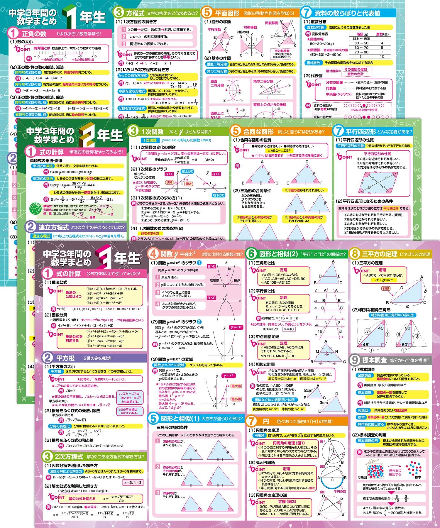 網羅的な内容カバー:このポスターセットは中学3年間の数学カリキュラムを網羅しており、1年生から3年生までの重要な数学の概念や公式をすべてカバーしています。式の計算、関数、図形の相似、三平方の定理など、各学年の主要なトピックが色分けされて整理されています。