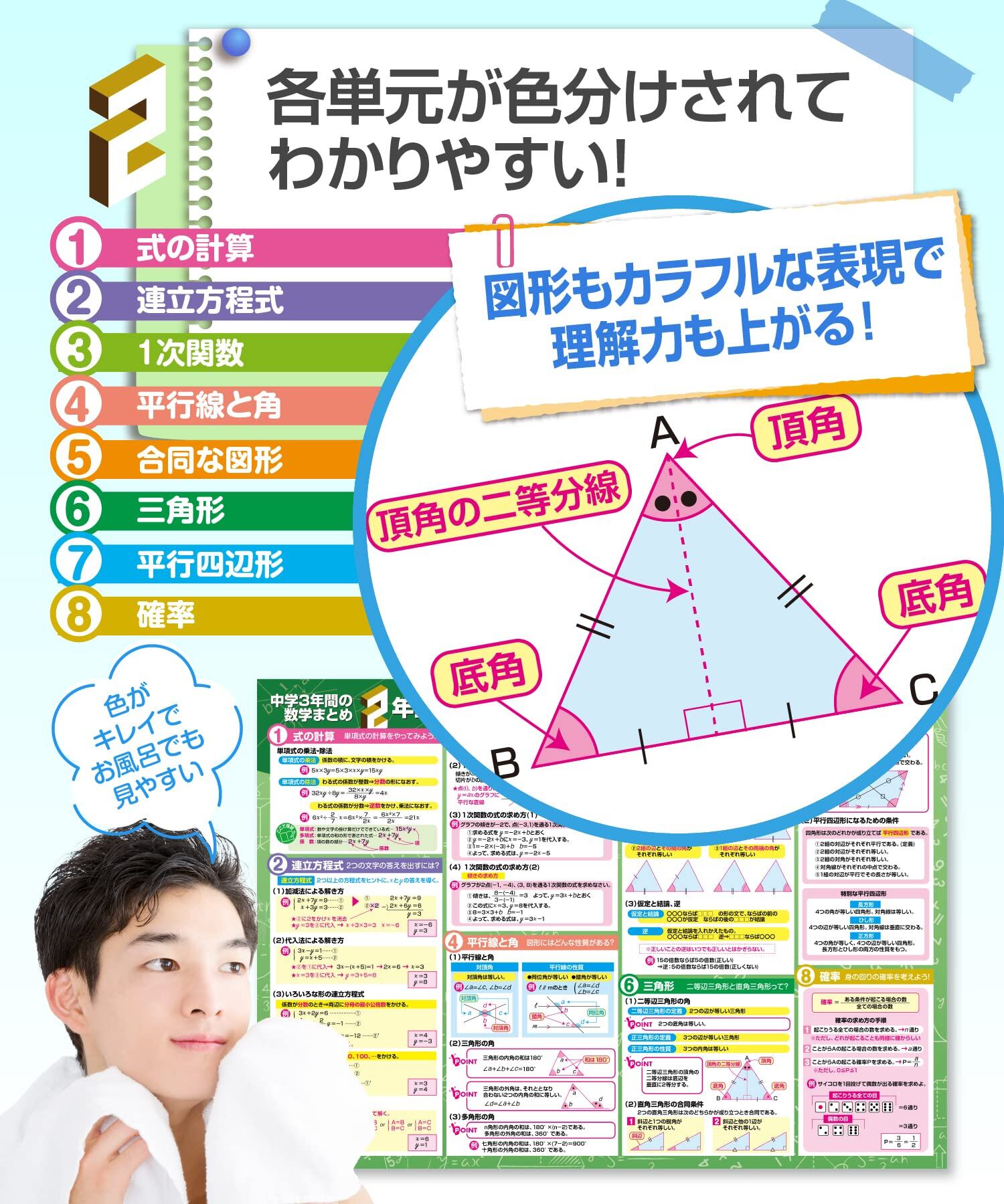 耐水性素材でお風呂でも使用可能:ポスターは耐水性の「ユポ紙」を使用しており、水だけで簡単に貼り付けることができます。これにより、お風呂場でも学習が可能で、バスタイムを有効活用して中学数学の習得ができます。耐久性が高く、長期間使用しても劣化しにくいです。