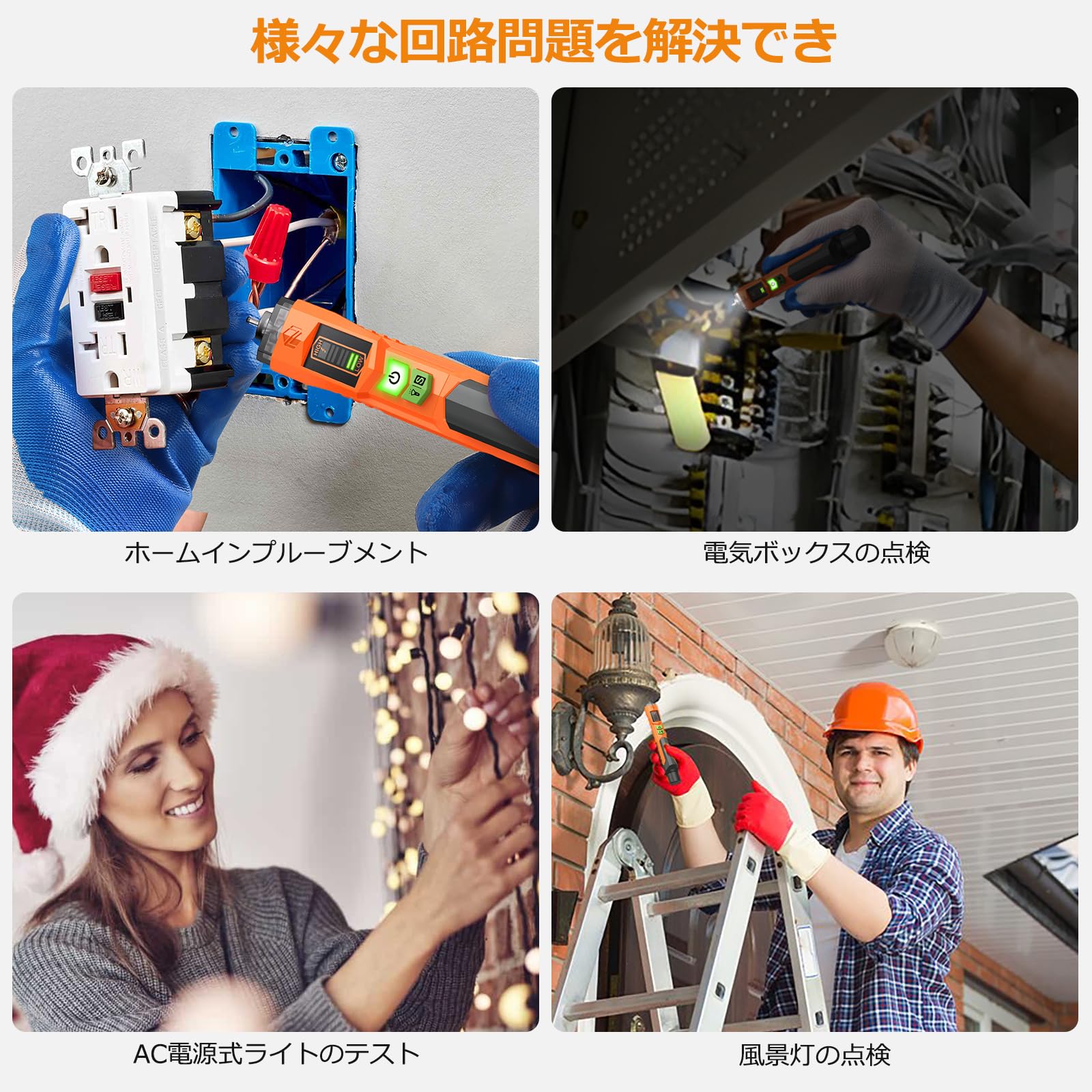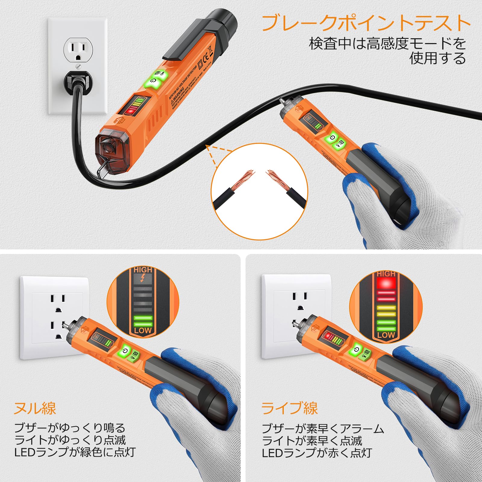 【ブレークポイントテスト】本検電器はブレークポイントの検査に最適です。テスターはラインに沿って検出され、インジケーターライトに従って断線位置を判断します。テスト中に高感度モードを使用すると、ブレークポイントを迅速に見つけるのに役立ち、電気工、家庭用の便利な電圧検出器として、電気問題を知らせます。