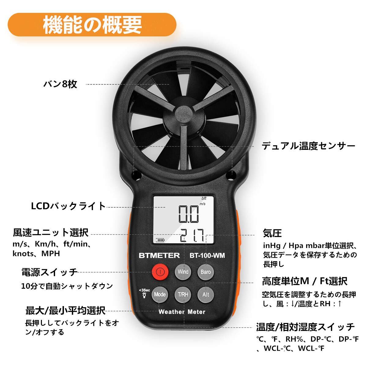 BTMETERデジタル風速計 風量計 風力計 気圧計 BT-100WM圧力計 風速&温度同時計測 風速風向計 簡易風量/高度/相対湿度/露点/大気測定 ドローンの飛行 登山 自動OFF バックライト HVAC CFM ストラップ&ドライバー付き 日本語説明書付き