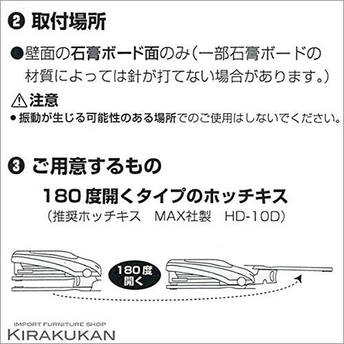 壁美人 フック かべびじん スモールフック Sタイプ 静止荷重1Kg:4個入り 【サイズ】幅 2.0×奥行 1.0×高さ 4.2cm 【静止荷重】1Kg(1個あたり) 【材質】フック・針 ステンレス製 【カラー】シルバー ※ご注意:使用するホッチキスは180度開くタイプをご使用下さい。また針は必ず付属の針(ステンレス製)をご使用下さい。 色 スモールフック 静止荷重1Kg ブランド 木楽館 材質 ステンレス鋼 仕上げタイプ ツヤ消し 取り付けタイプ 美人