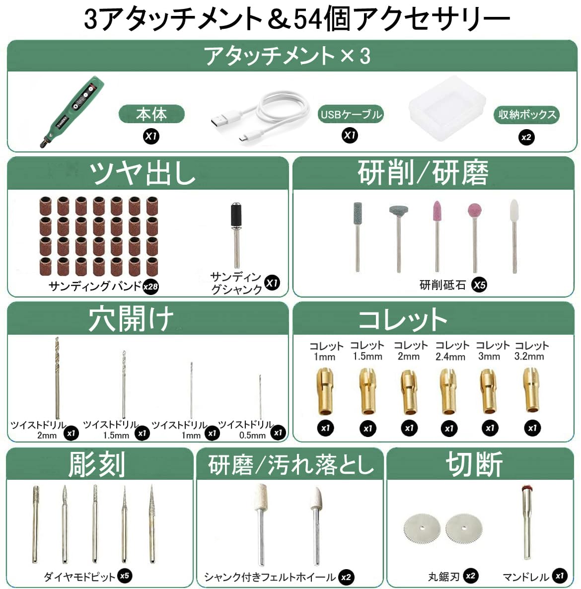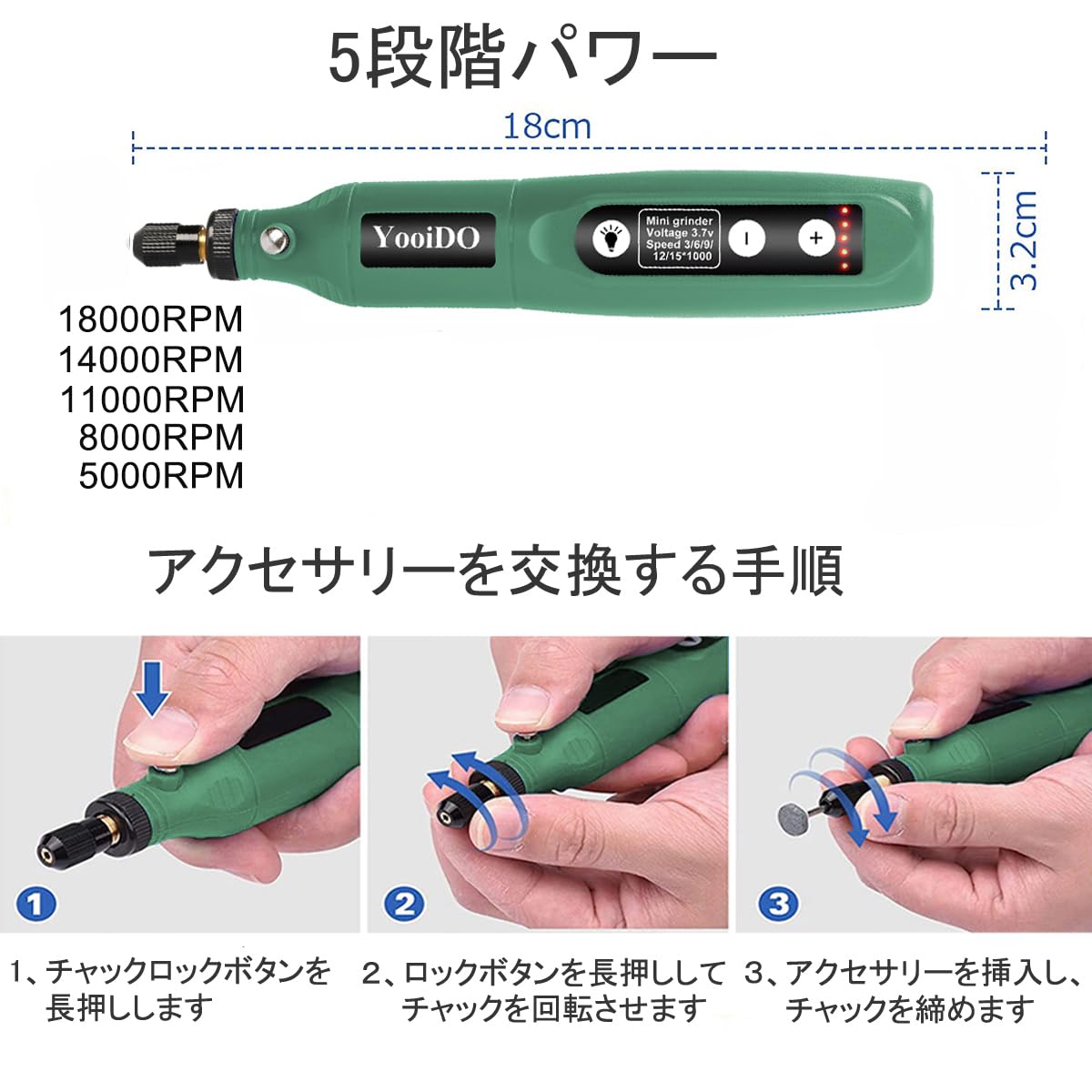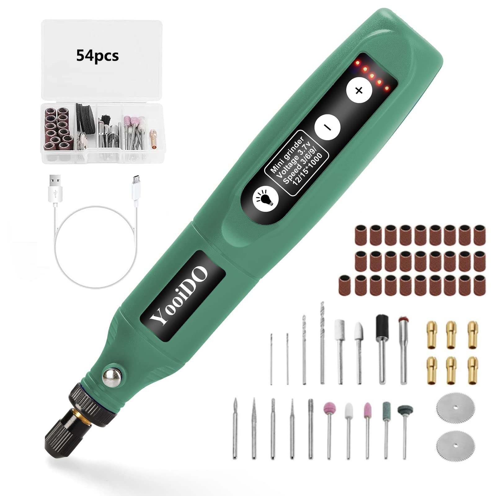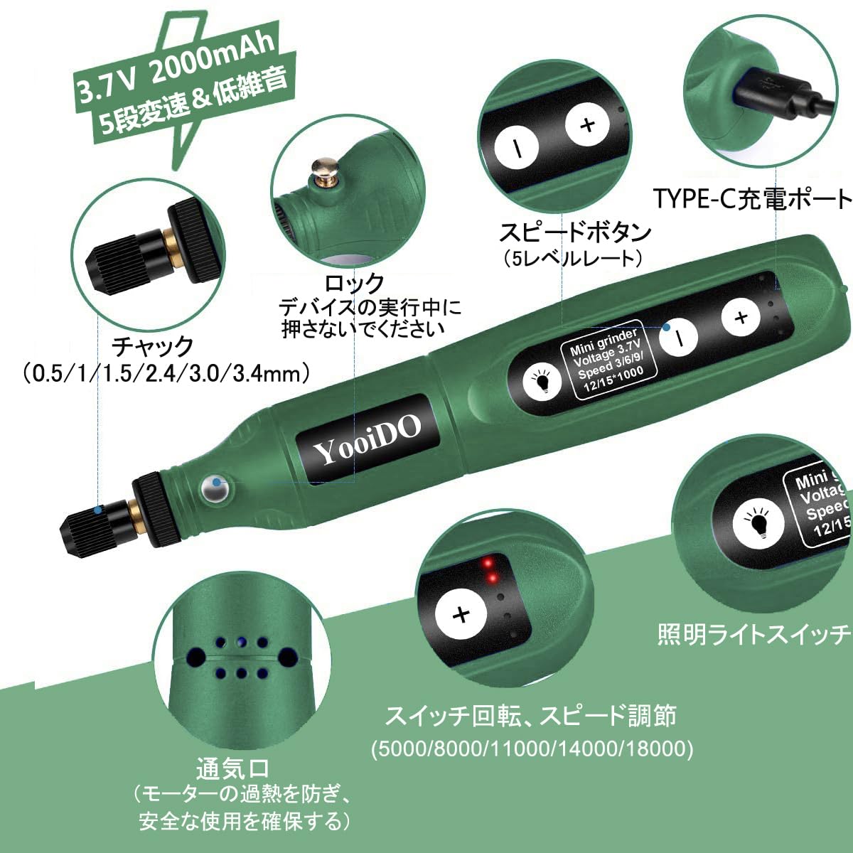 ミニルーター リューター コンパクトルーター 5段変速 54PCSセットYooiDOルーター工具 2000mAhリューター 電動 18000RPM高速回転 USB充電式 コードレス 研磨/彫刻/切削/穴あけ/汚れ落とし/錆落とし/切断/つや出し/ネイルアート DIY軽作業 電動ルーター 充電式りゅーたー 照明ライト付き プレゼント 父親 男性 ギフト 日本語取扱い説明書(アーミーグリーン)