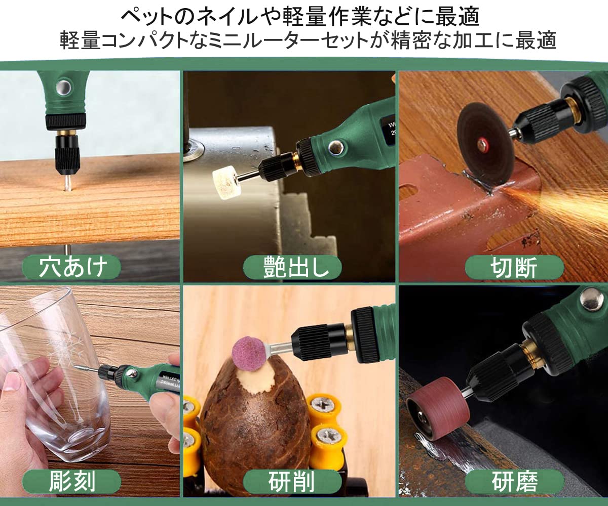 【USB充電式&コードレス】リューター充電式のモデルはコードレス式で、作業中にコードに邪魔される心配しません。リチウム電池を採用して、普通なMirco USBで接続して充電できます。電池容量は2000mAhで、2時間(無負荷)作業し続けられます。 ガラス彫刻や金属研磨・穴あけ・つや出し・模型工作などに対応できる、DIYや趣味など幅広い場所で使い勝手よく楽々。