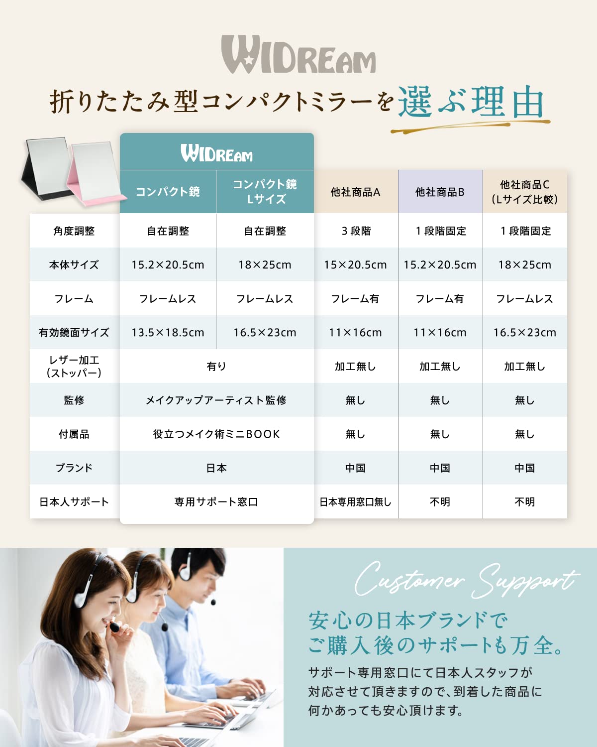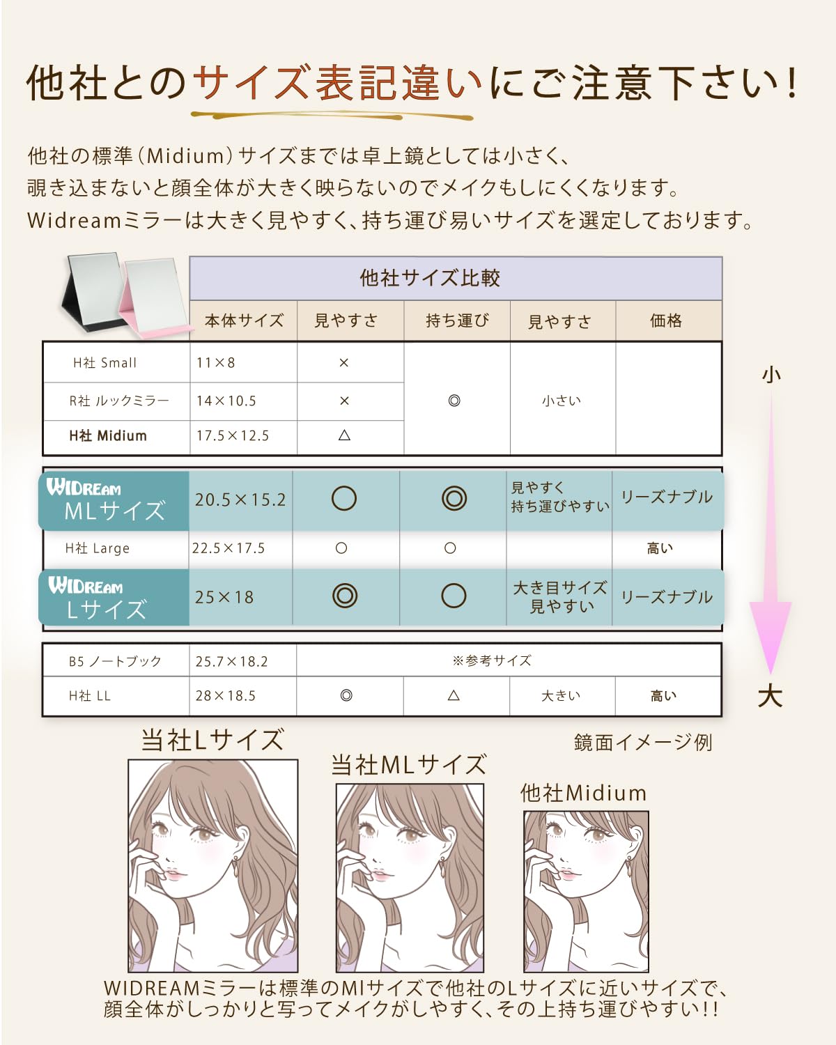 ??他社とのサイズ表記違いにご注意下さい。WIDREAM卓上鏡は他社より1サイズ大きくリーズナブル!!