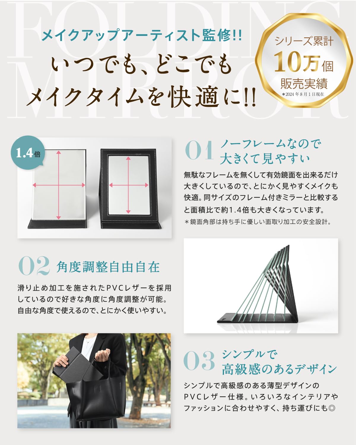??いつでもどこでもメイクタイムを快適に!! メイクアップアーティスト監修で使いやすさを追及した折りたたみ式の卓上鏡です。