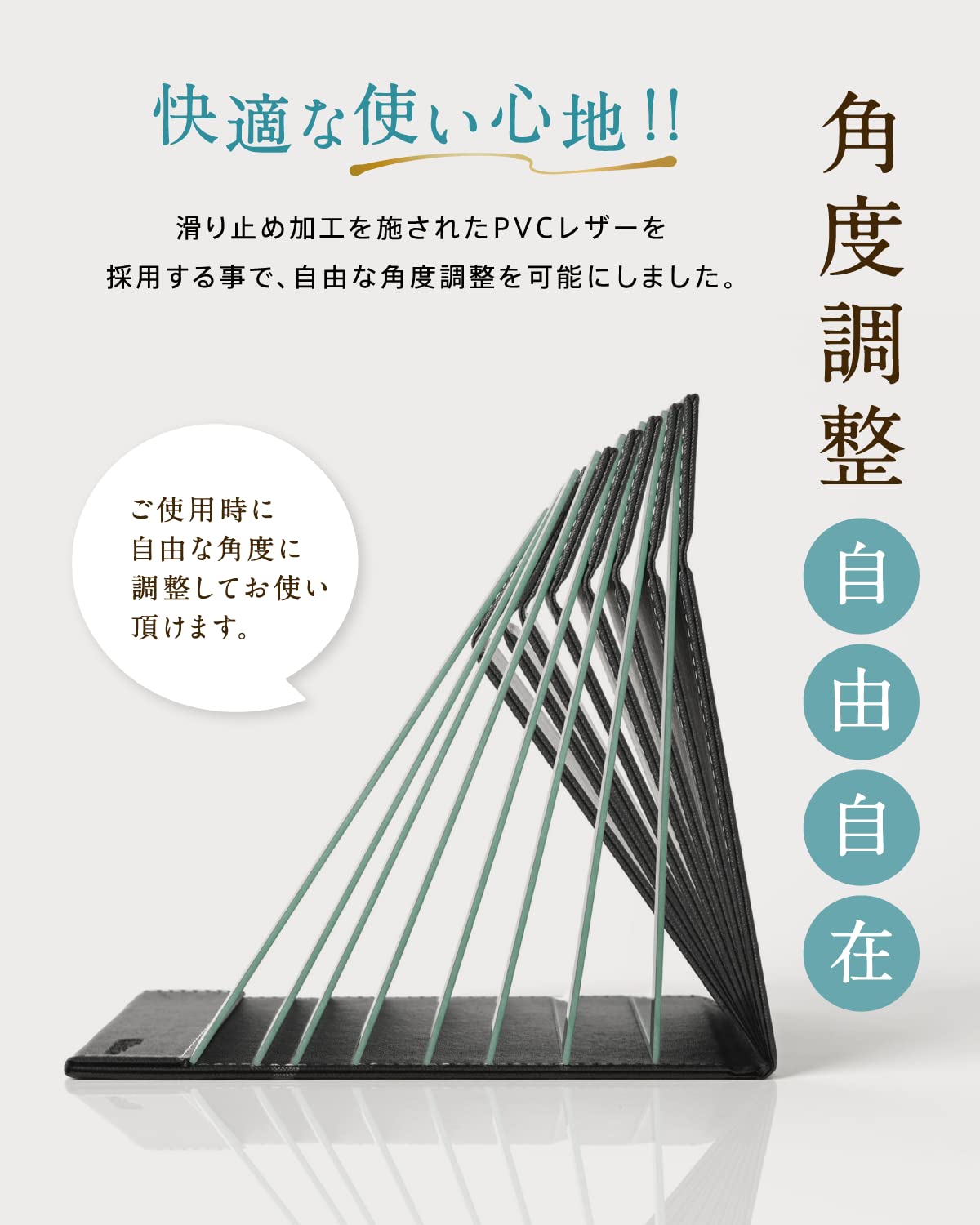 ??滑り止め加工を施されたPVCレザーを採用しているので角度調整が自由に行えます。
