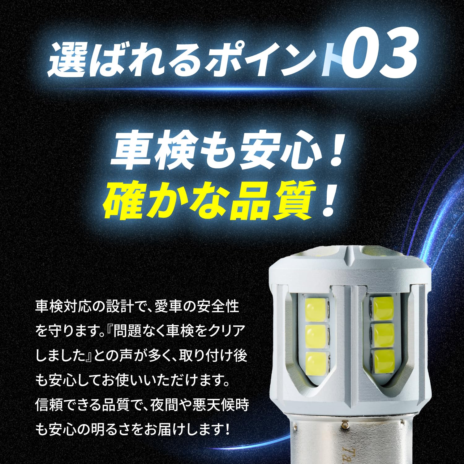 ?【 車検も安心!確かな品質!】 車検対応の設計で、愛車の安全性を守ります。 『問題なく車検をクリアしました』との声が多く、取り付け後も安心してお使いいただけます。 信頼できる品質で、夜間や悪天候時も安心の明るさをお届けします!